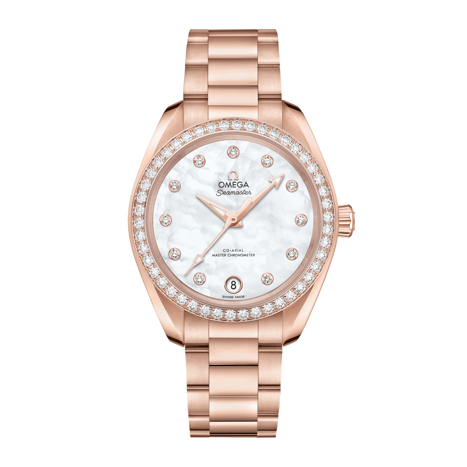 The Omega Aqua Terra Rose Gold Diamond Mother of Pearl Dial 34mm Ref. 220.55.34.20.55.001 is a luxurious timepiece that embodies craftsmanship and precision. The 34mm symmetrical case is made from polished 18K rose gold and features a diamond-set bezel, blending elegance with durability. The pearled white mother-of-pearl dial is enhanced by 11 diamond hour markers set in 18K rose gold holders, along with a discreet date window at 6 o’clock. The facetted rose gold hands ensure clear readability, while the scratch-resistant sapphire crystal protects the dial. Powered by the Co-Axial Master Chronometer Calibre 8801, this self-winding movement delivers a 55-hour power reserve and is METAS-certified for accuracy, performance, and magnetic resistance. The integrated 18K rose gold bracelet, equipped with a deployment clasp, offers a seamless and secure fit. Water-resistant to 150 meters, the Ref. 220.55.34.20.55.001 is a sophisticated blend of luxury and technical excellence.Read More