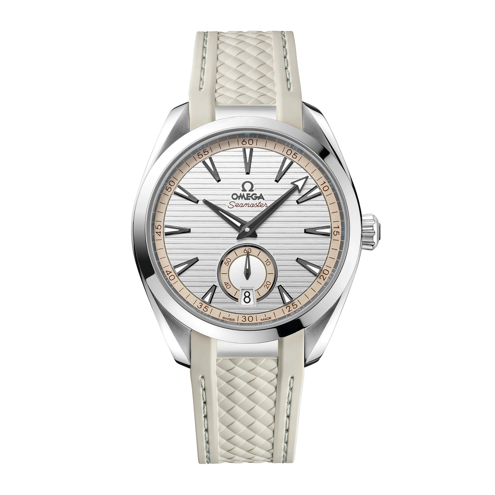 The Omega Aqua Terra Small Seconds Steel Silver Dial 41mm Ref. 220.12.41.21.02.005 features a 41mm symmetrical stainless steel case paired with a distinctive wave-edged caseback, echoing Omega’s maritime roots. Its brushed silvery-beige dial displays the recognizable horizontal “teak” pattern, a date window at 6 o’clock, and an opaline Small Seconds subdial with a blackened ring. Blackened hands and indexes filled with white Super-LumiNova ensure high visibility, while sandblasted minute and seconds tracks add a layer of detail. The watch is presented on a structured beige rubber strap with grey stitching and a stainless steel pin buckle for modern comfort. Powered by the OMEGA Co-Axial Master Chronometer calibre 8916, this reference meets METAS certification for precision and magnetic resistance, offers a 60-hour power reserve, and is water-resistant up to 150 meters, making it a reliable and contemporary everyday option.Read More