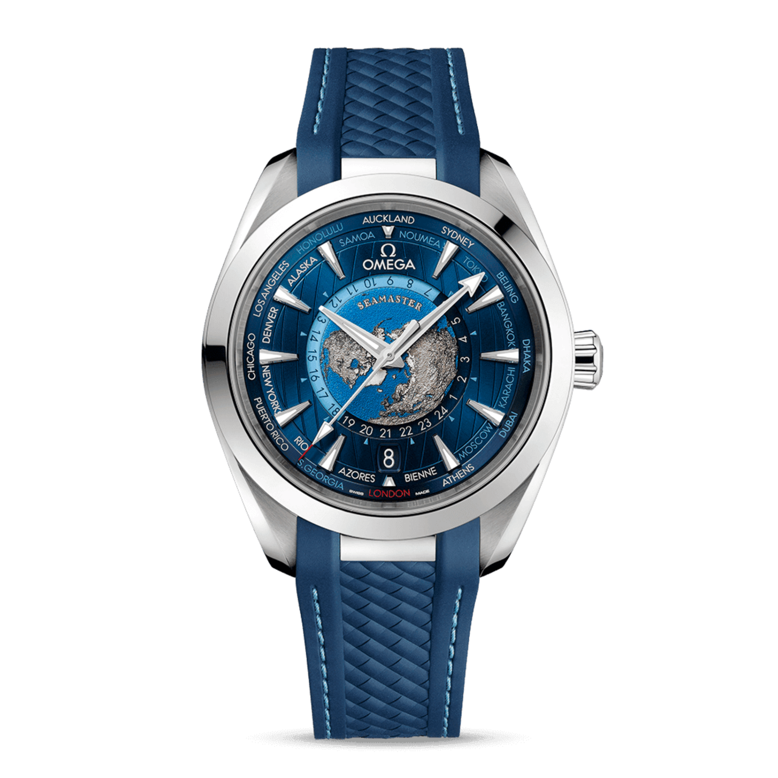 Discover the Omega Aqua Terra Worldtimer Steel Blue Dial, ref. 220.12.43.22.03.001. This impressive 43mm watch is designed for the global traveler, featuring a striking blue dial with luminescent index markers for optimal readability. Crafted from stainless steel, the Aqua Terra is powered by the self-winding Calibre 8938 movement, offering a robust 60-hour power reserve. This timepiece includes essential functions such as hours, minutes, seconds, world time, and date, all protected by a scratch-resistant sapphire crystal. With a water resistance of up to 150 meters, this watch is perfect for various environments, from the office to aquatic adventures. The blue rubber strap, secured with a stainless steel deployment clasp, ensures both comfort and style. Launched in 2019, the Omega Aqua Terra Worldtimer Steel Blue Dial is an ideal choice for those who value functionality combined with sophisticated design, making it a standout addition to any collection.Read More