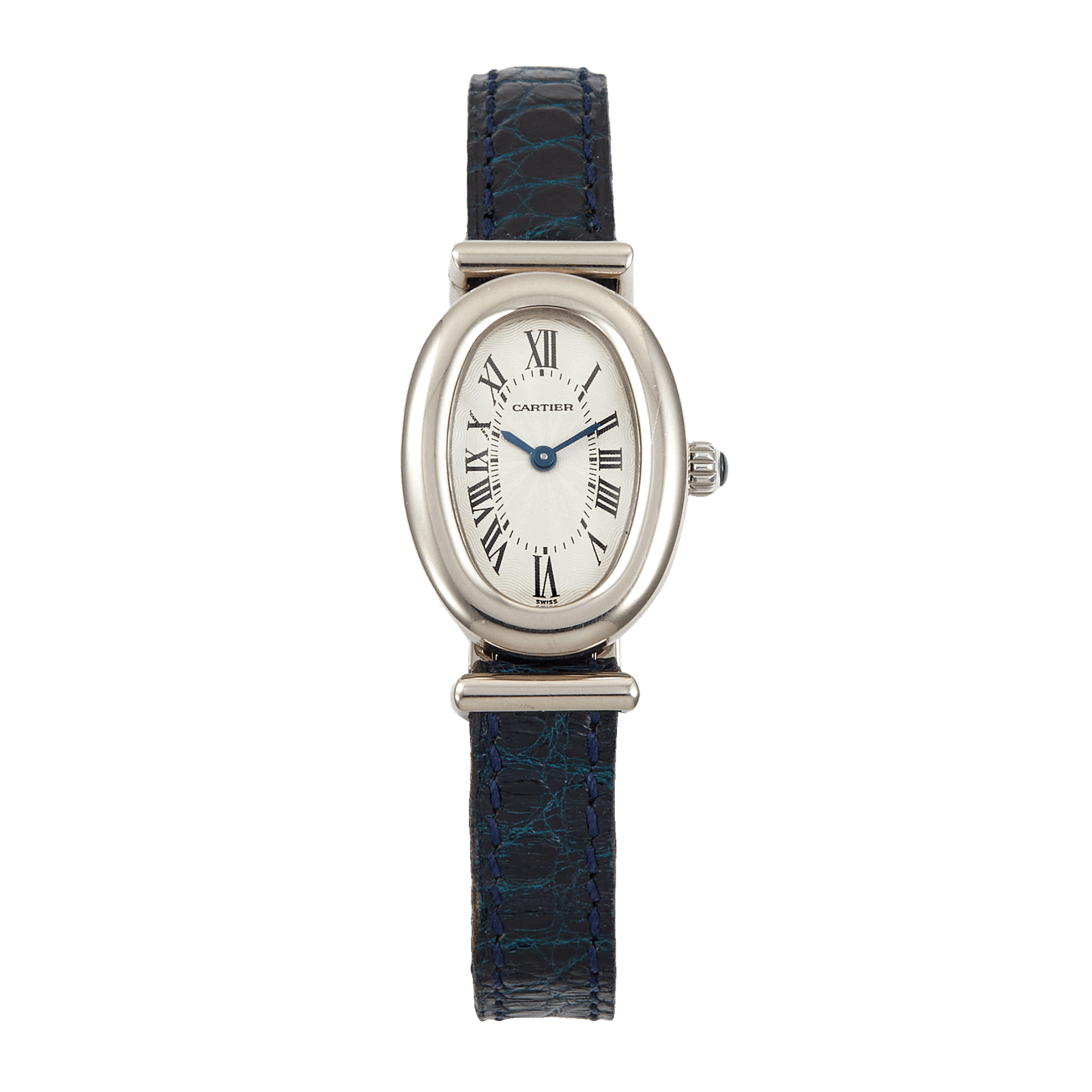 The Cartier Baignoire Bi-Plan White Gold White Dial ref. W1514957 is an iconic and timeless classic.  Crafted from lustrous 18k white gold, this exquisite timepiece highlights a sleek design that captivates at any event. Its distinct oval-shaped white dial, a signature feature of the Baignoire collection, marries comfort with classic style, ensuring it looks as good as it feels on the wrist. Featuring Roman numeral hour markers and blue sword-shaped hands, the watch maintains a traditional Cartier aesthetic, set against a crisp white background. Reliable quartz movement within ensures timekeeping is both precise and dependable, ideal for daily wear. Perfect for connoisseurs of luxury and style, the Cartier Baignoire Bi-Plan is more than a timepiece; it’s a testament to refined taste. Whether as a thoughtful gift or a personal indulgence, this Cartier watch promises to charm with its timeless elegance and exceptional craftsmanship.