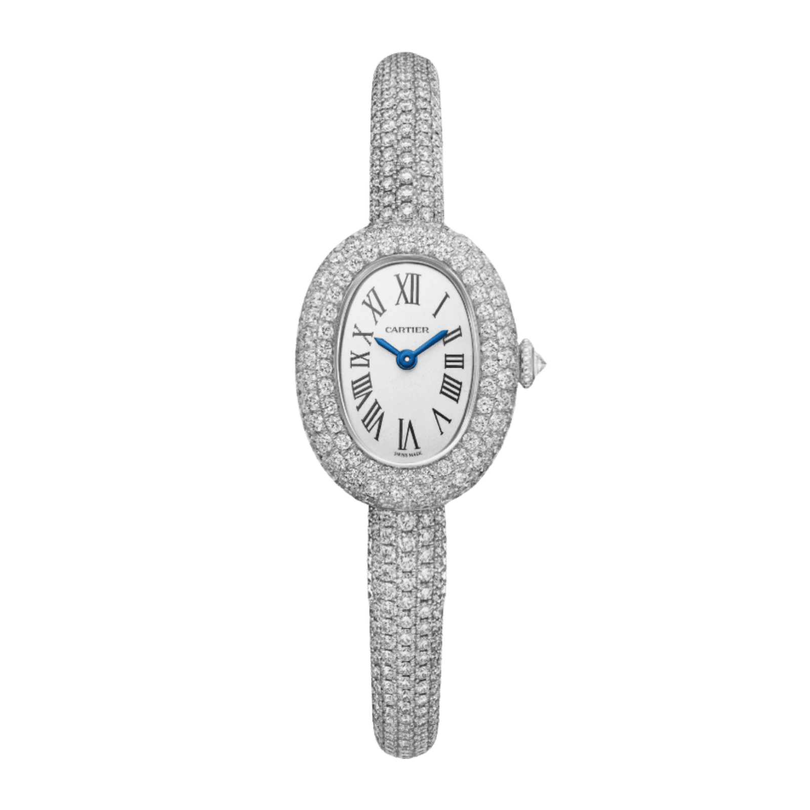 At just 18mm in case width, the watch wears more like a precious accessory than a traditional wristwatch, yet retains Cartier’s hallmark refinement. The white gold bezel is entirely pavé-set, framing a silver dial with Roman numerals and blued-steel sword hands. A sapphire cabochon crowns the fluted crown. Inside, a high-precision quartz movement ensures reliable timekeeping without the need for daily winding. Water resistance is rated to 30 metres.