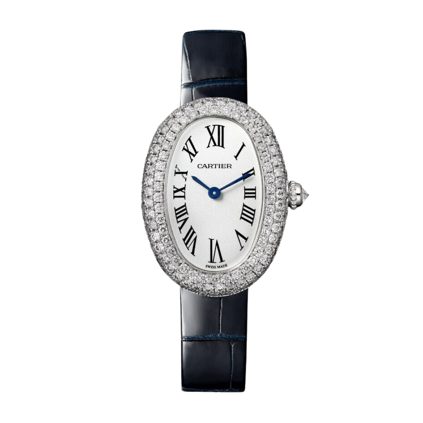 Introducing the Cartier Baignoire de Cartier White Gold Diamond Silver Dial, ref. WJBA0015. This elegant 26mm watch embodies the essence of refined luxury with its unique oval shape and exquisite craftsmanship. The 750/1000 white gold case is adorned with brilliant-cut diamonds, enhancing its sophisticated appeal. A beaded crown, also set with a brilliant-cut diamond, complements the silvered dial, which features Roman numeral indexes and blued-steel sword-shaped hands for clear readability. Powered by a precise quartz movement, this watch offers reliable timekeeping and is water-resistant up to 30 meters, suitable for everyday wear. The navy blue alligator-skin strap is secured with a rhodium-finish white gold ardillon buckle, ensuring both comfort and elegance. With a thickness of just 8mm, the Baignoire de Cartier is a perfect accessory for those who appreciate the fusion of classic design and modern functionality, representing Cartier’s watchmaking legacy since its inception.Read More