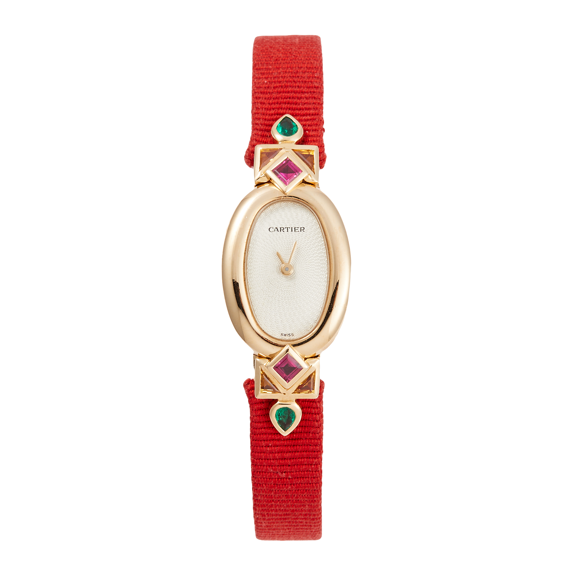 Discover the Cartier Baignoire Mini, a harmonious blend of luxury and sophistication. This timepiece features a distinct oval case crafted from yellow gold, enhancing its elegant silhouette. The white dial showcases subtle textures, providing a refined backdrop for the watch’s classic appeal. Notably, the bezel is adorned with exquisite emerald and ruby gems, adding vibrant color and a unique touch to the design. The watch’s quartz movement ensures reliable timekeeping, making it suitable for everyday wear. Complemented by a striking red fabric strap, the Baignoire Mini is secured with a yellow gold folding clasp for comfort and security. The sapphire crystal protects the dial, ensuring clarity and durability. This model exemplifies Cartier’s commitment to artistry and craftsmanship, making it a perfect choice for those who appreciate fine watchmaking with a modern twist. The Cartier Baignoire Mini is not just a watch; it’s a statement piece that enhances any collection.Read More