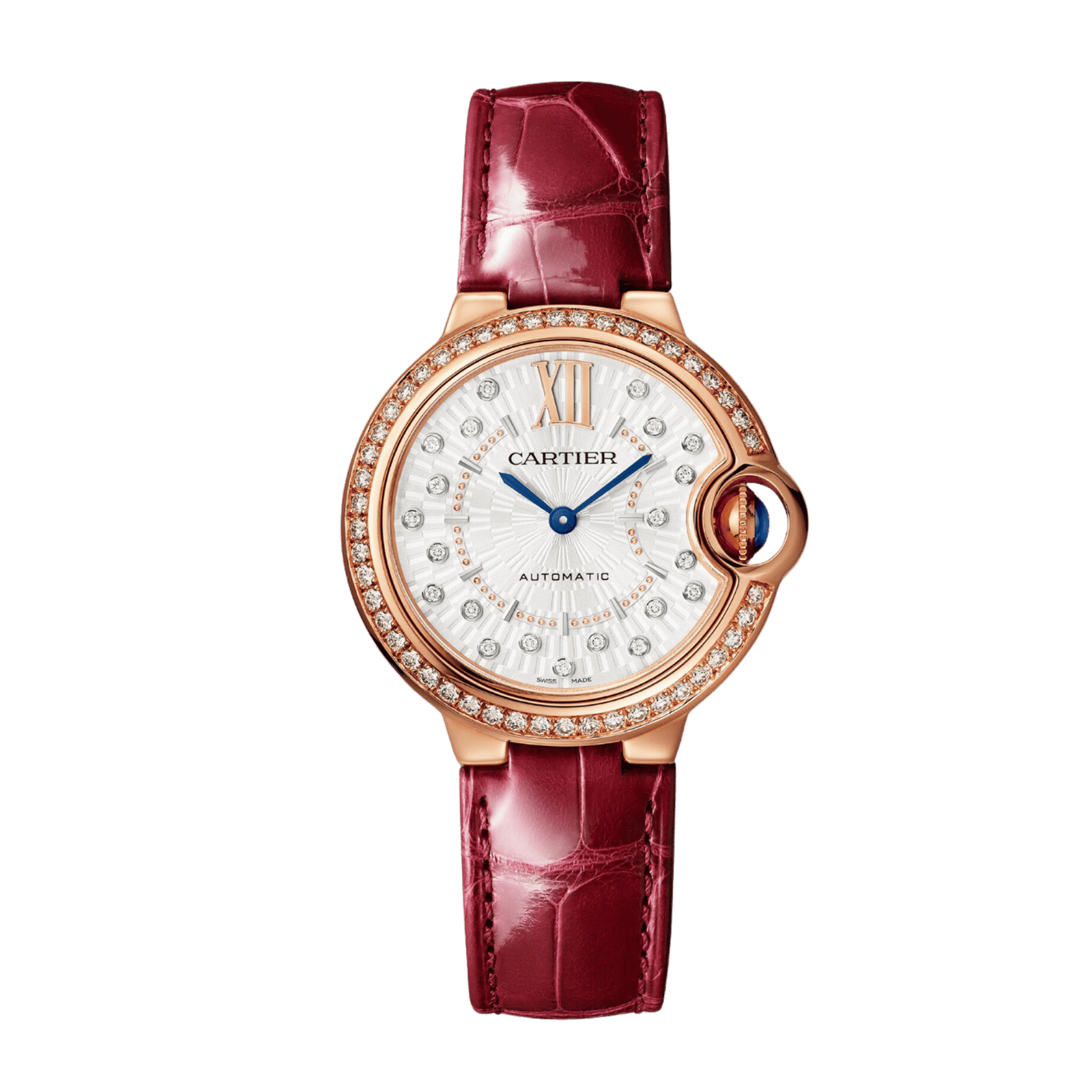 Introducing the Cartier Ballon Bleu de Cartier Rose Gold Diamond Silver Dial 33mm, ref. WJBB0080. This elegant watch features a rose gold 750/1000 case adorned with 47 brilliant-cut diamonds, totaling 0.68 carats, showcasing luxury and sophistication. The self-winding mechanical movement ensures precision, while the matt silvered stamped sunray dial includes an additional 21 diamonds totaling 0.10 carats for a refined touch. With a case diameter of 33mm and a thickness of just 0.4 inches, this timepiece provides a comfortable fit. The fluted crown, set with a cabochon sapphire, enhances its unique design. Water-resistant up to 30 meters, it’s suitable for everyday wear. The burgundy alligator leather strap, secured by a rose gold ardillon buckle, complements the overall aesthetic. The Ballon Bleu de Cartier embodies a perfect blend of style and functionality, making it an essential addition to any luxury watch collection.Read More