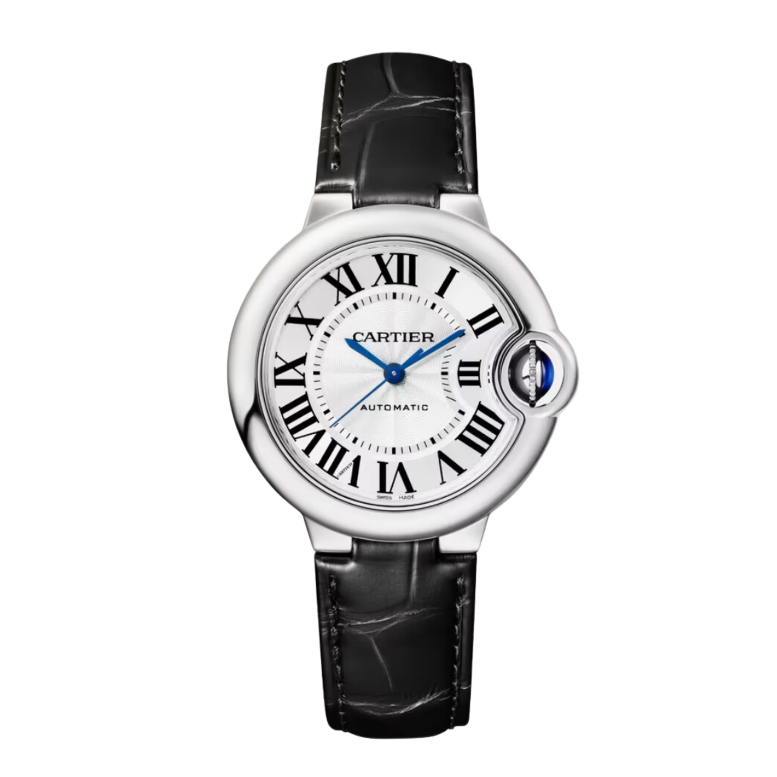 Introducing the Cartier Ballon Bleu de Cartier Steel Silver Dial, ref. WSBB0030. This elegant 33mm timepiece seamlessly combines sophisticated design with reliable performance, making it a versatile choice for any occasion. The silvered guilloché opaline dial features classic Roman numeral indexes and blued-steel sword-shaped hands, ensuring clarity and style. Encased in stainless steel, the watch is highlighted by a fluted crown set with a synthetic cabochon-shaped spinel. Powered by a self-winding mechanical movement, this watch guarantees precision and reliability. With a water resistance of up to 30 meters, it is suitable for everyday wear. The black alligator-skin strap adds a luxurious touch and is complemented by an interchangeable stainless steel folding buckle. With a thickness of 10.16mm, the Ballon Bleu de Cartier offers a comfortable fit on the wrist. Launched in 2007, this watch exemplifies Cartier’s commitment to quality and craftsmanship.Read More