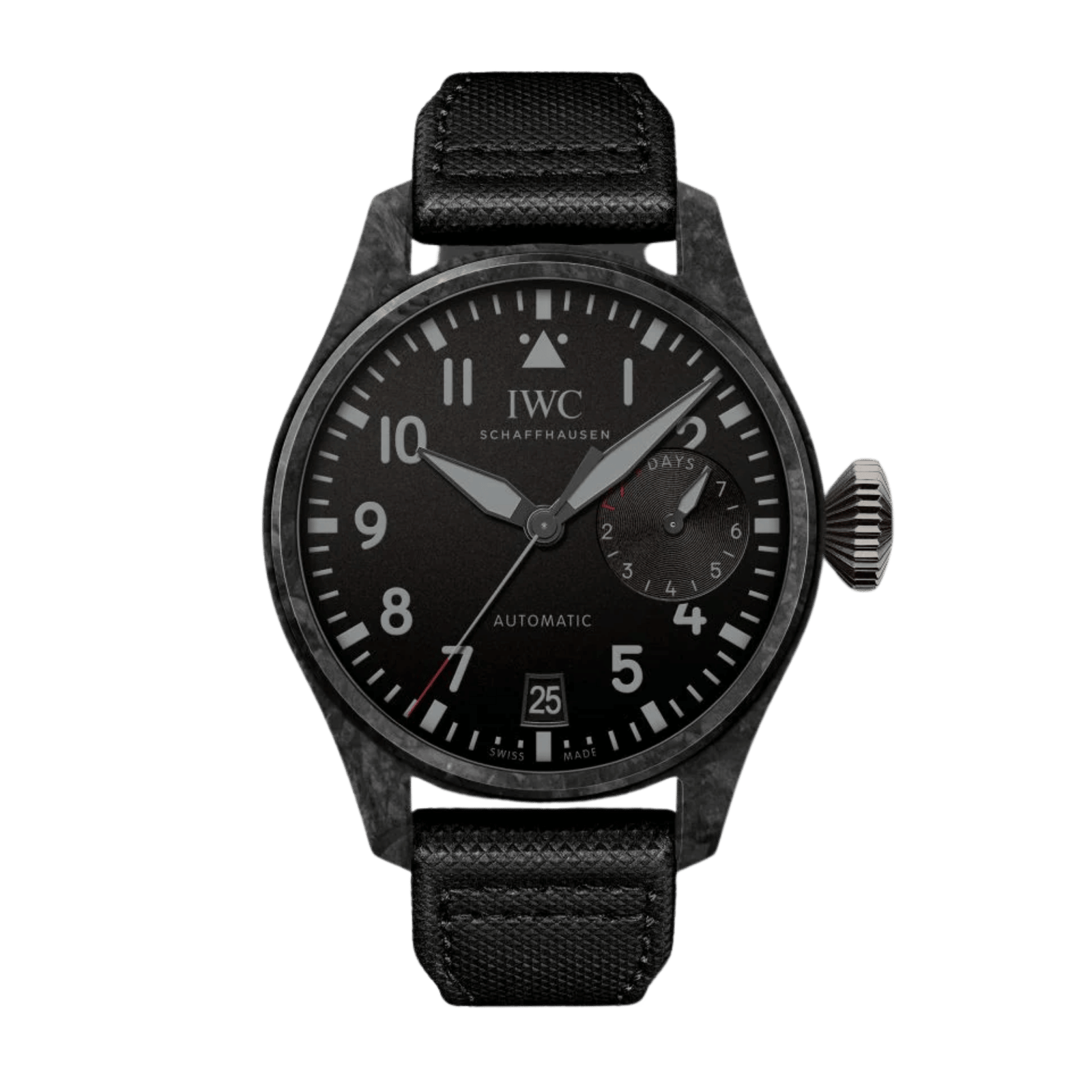 The IWC Big Pilot’s Watch Carbon Black Dial 46mm Ref. IW506101 is a limited edition of 100 pieces introduced in 2020, featuring a robust 46mm carbon case with a titanium caseback and crown for enhanced strength and reduced weight. Powered by the selfwinding Calibre 52110, it delivers an impressive 168-hour power reserve and includes hours, minutes, central seconds, date display, and a power reserve indicator for precise time management. The black dial, marked with bold Arabic numerals, provides high legibility and classic pilot watch aesthetics, all protected by a sapphire crystal. A black calfskin leather strap with a stainless steel folding clasp ensures both comfort and durability. Water resistance is rated to 50 meters, supporting reliable everyday wear. This model stands out for its advanced materials, technical performance, and exclusive production, appealing to collectors and enthusiasts seeking innovation and heritage in a modern pilot’s watch.Read More