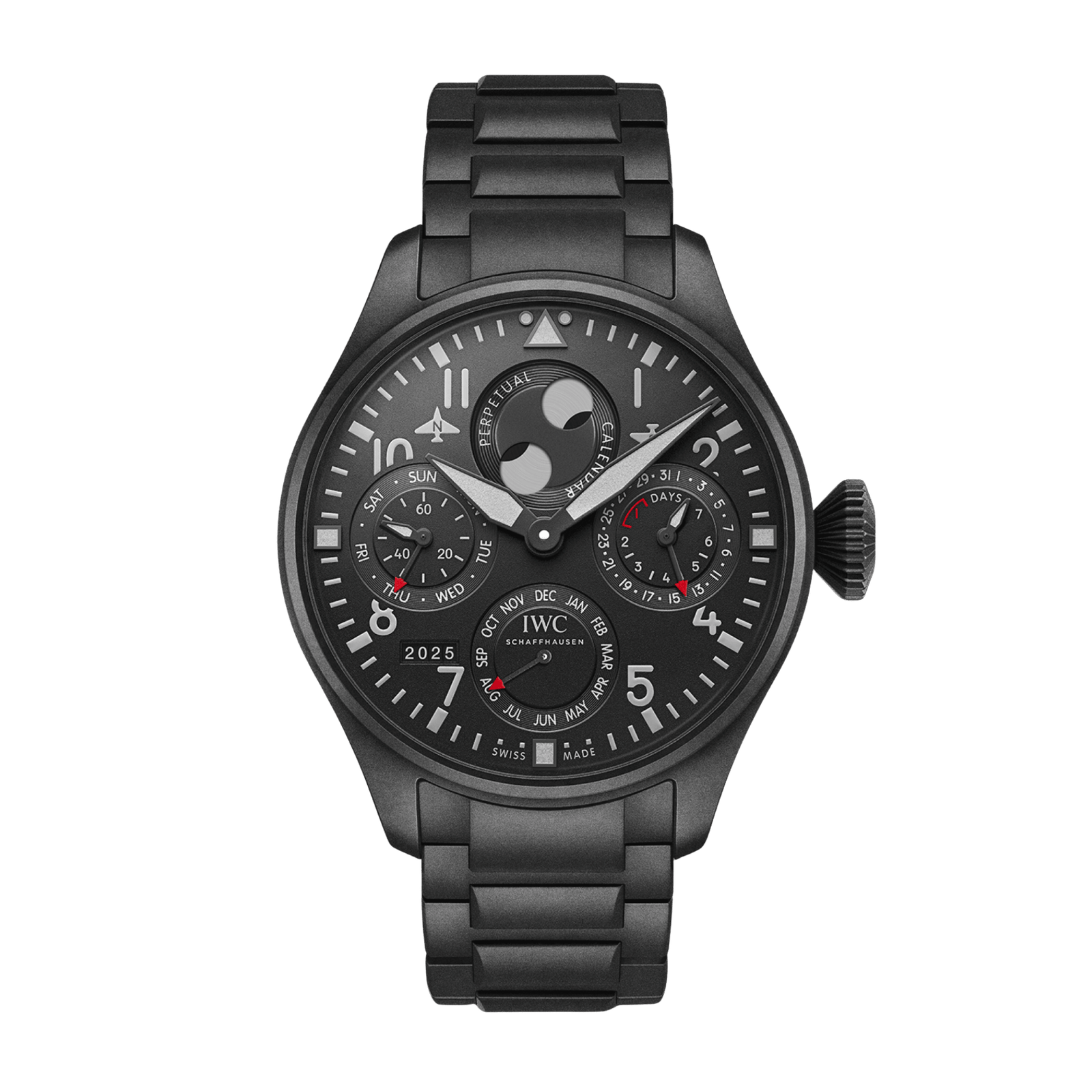 Powering the display of date, day, month, year, and moonphase is the in-house calibre 52615, a self-winding movement with dual barrels delivering a 7-day power reserve. The black dial design ensures high legibility of the calendar indications, while red accents subtly nod to IWC’s Top Gun lineage. Water-resistant to 60m, the watch balances the authority of a pilot’s instrument with the refinement of a grand complication.
