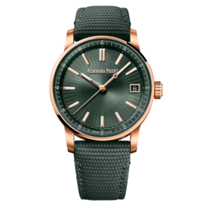 The Audemars Piguet Code 11.59 Chronograph (ref. 26393OR.OO.A056KB.01) showcases the Maison’s contemporary design language through a bold interplay of material and colour. Its 41mm case, crafted in 18-carat pink gold, is framed by the model’s signature octagonal midcase and double-curved sapphire crystal, while the gradient green dial offers a vivid backdrop to the applied hour markers and chronograph counters.