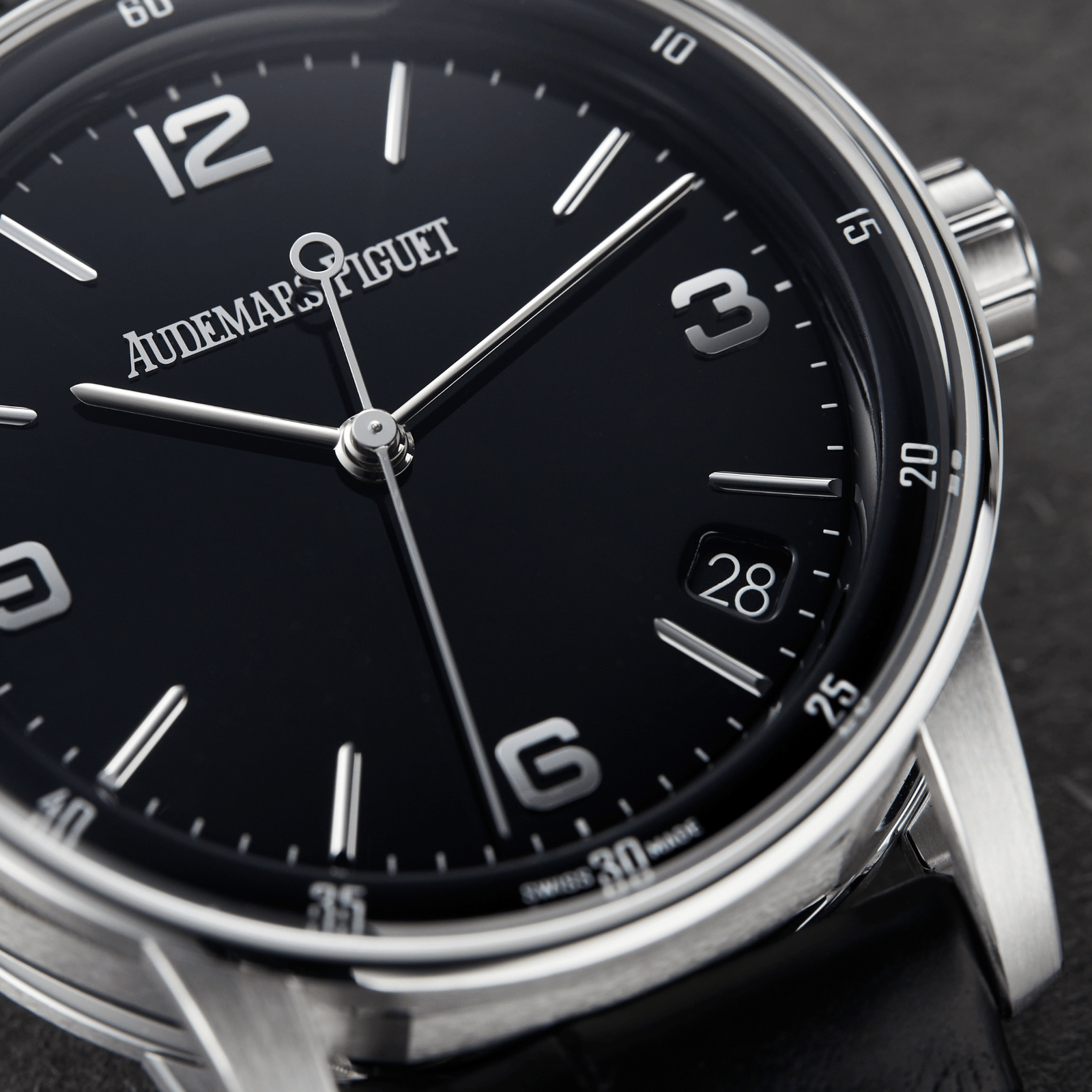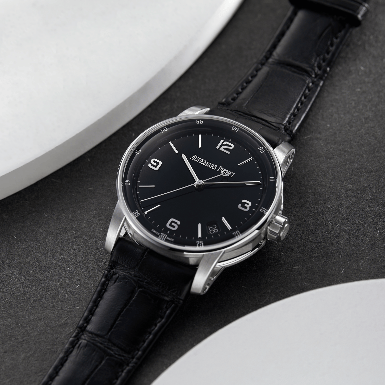 Introducing the Audemars Piguet Code 11.59, a remarkable timepiece that redefines modern luxury. Launched in 2019, this collection marks a bold new direction for the brand, combining traditional watchmaking with contemporary design elements. The 41mm white gold case features a striking black dial, which enhances the watch’s sophisticated aesthetic. The sleek design includes a sapphire crystal for durability and clarity, allowing the intricate details to shine. With its elegant hour markers and hands, the dial ensures easy readability. Powered by the Calibre AP 4302 self-winding movement, this watch offers an impressive 70-hour power reserve and functions for hours, minutes, seconds, and date. Its versatility makes it suitable for both formal occasions and everyday wear. The black alligator leather strap adds a luxurious touch, secured with a pin buckle for comfort and style. The Audemars Piguet Code 11.59 White Gold Black Dial is a perfect choice for discerning collectors and enthusiasts, embodying the perfect balance of elegance and functionality. Elevate your wrist with this iconic timepiece that celebrates the essence of modern horology.Read More