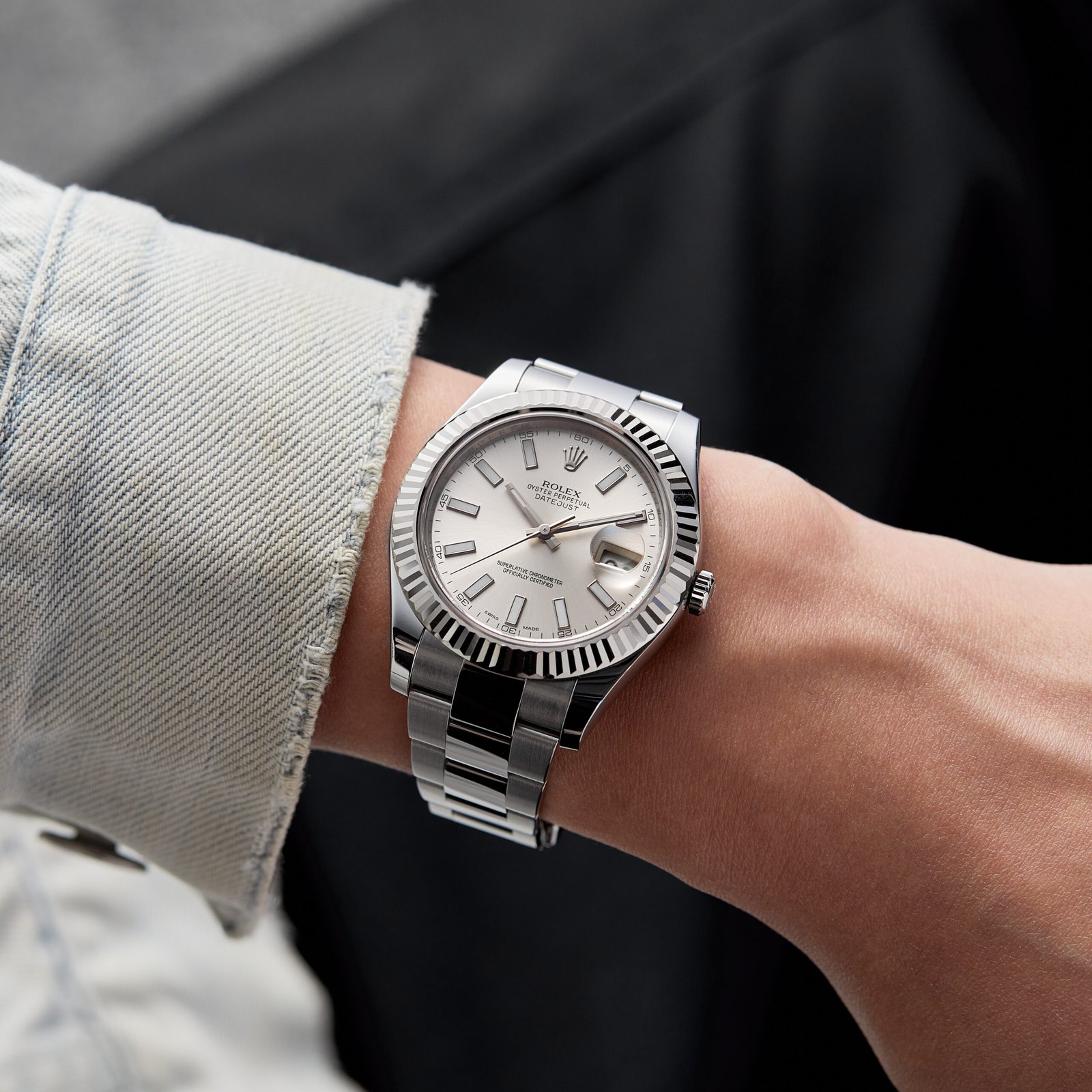 The Rolex Datejust II Ref. 116334 stands as a testament to timeless sophistication in the world of luxury timepieces, crafted from Oystersteel to ensure peerless durability and a lustrous finish. Its commanding 41mm case houses a striking silver dial that provides a pristine backdrop for the hands and hour markers, all fashioned from premium materials to guarantee optimal legibility. A prominent feature is the date aperture, positioned at the 3 o’clock mark, which includes the brand’s hallmark Cyclops lens for enhanced date readability. Surrounding the dial, the bezel, created from 18ct white gold, is fluted—a Rolex signature—offering not only a distinctive aesthetic but also a testament to the brand’s watchmaking prowess. The watch is secured on the wrist by the Oyster bracelet, an archetype of robustness and comfort, featuring solid links and a concealed attachment system that delivers seamless visual continuity between bracelet and case. At its core, the Datejust II operates on Rolex’s own Calibre 3136, an automatic movement that benefits from the brand’s cutting-edge technology, ensuring superlative performance. The movement is sheltered by a Twinlock double waterproofness system, reinforcing the watch’s resilience with a water resistance rating of up to 100 meters. This harmonious combination of form and function makes the Datejust II an emblematic choice for the watch collector.