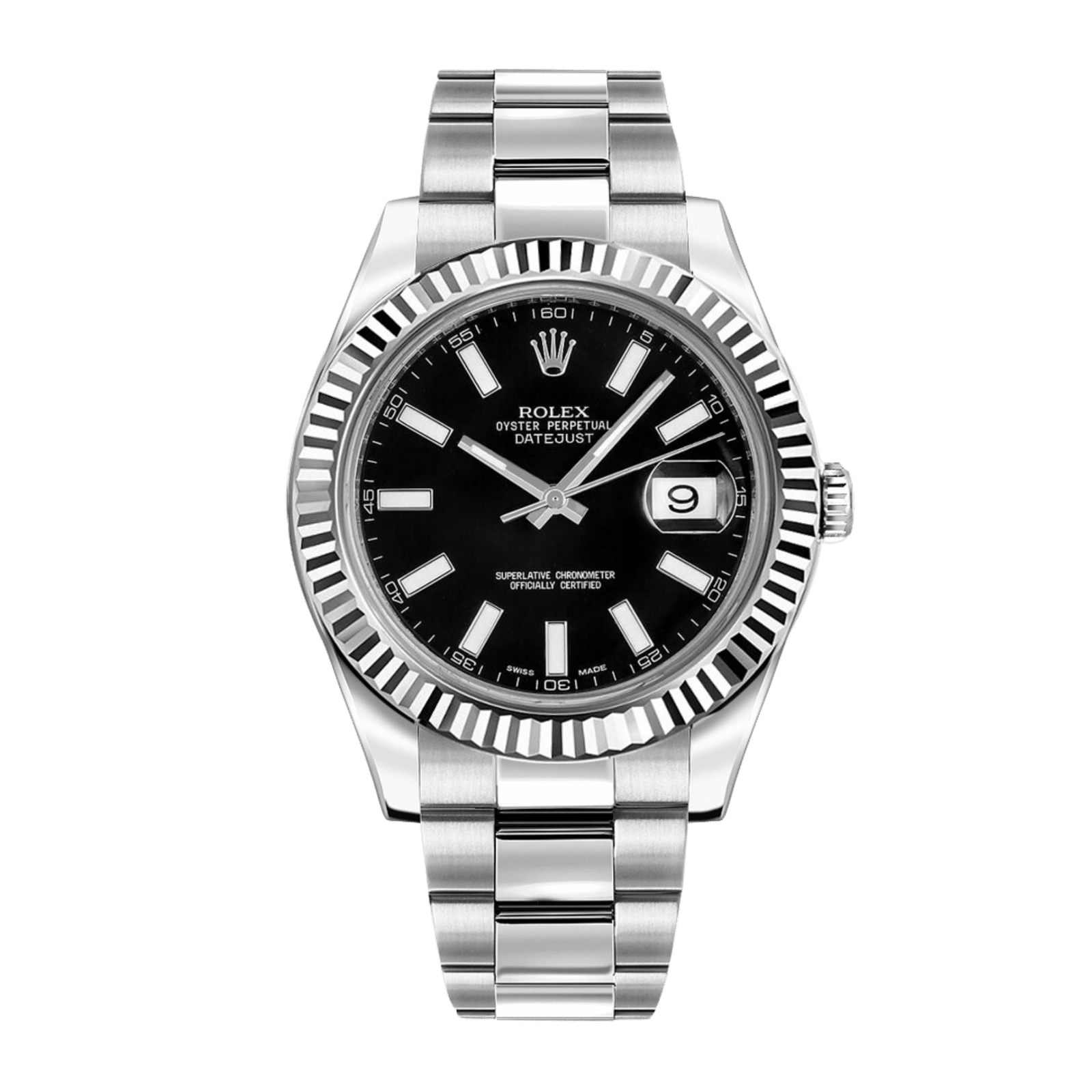 Introducing the Rolex Datejust Steel Black Dial 41mm ref. 116334 Black, a sophisticated blend of style and functionality. This model features a robust 41mm stainless steel case with a striking fluted bezel crafted from white gold and BMG-TECH, enhancing its luxurious appeal. The black dial is equipped with luminescent index markers for improved visibility, while the date function adds practical convenience. Powered by the self-winding Calibre 3136 movement, it offers a reliable 48-hour power reserve and chronometer precision. The stainless steel bracelet is designed for comfort and security, featuring a folding clasp for a secure fit. With a water resistance of up to 100 meters, the Datejust is suitable for both formal occasions and daily wear. Launched in 2009, the Rolex Datejust ref. 116334 Black stands as a testament to Rolex’s commitment to quality and craftsmanship, making it a vital addition to any watch collection.Read More