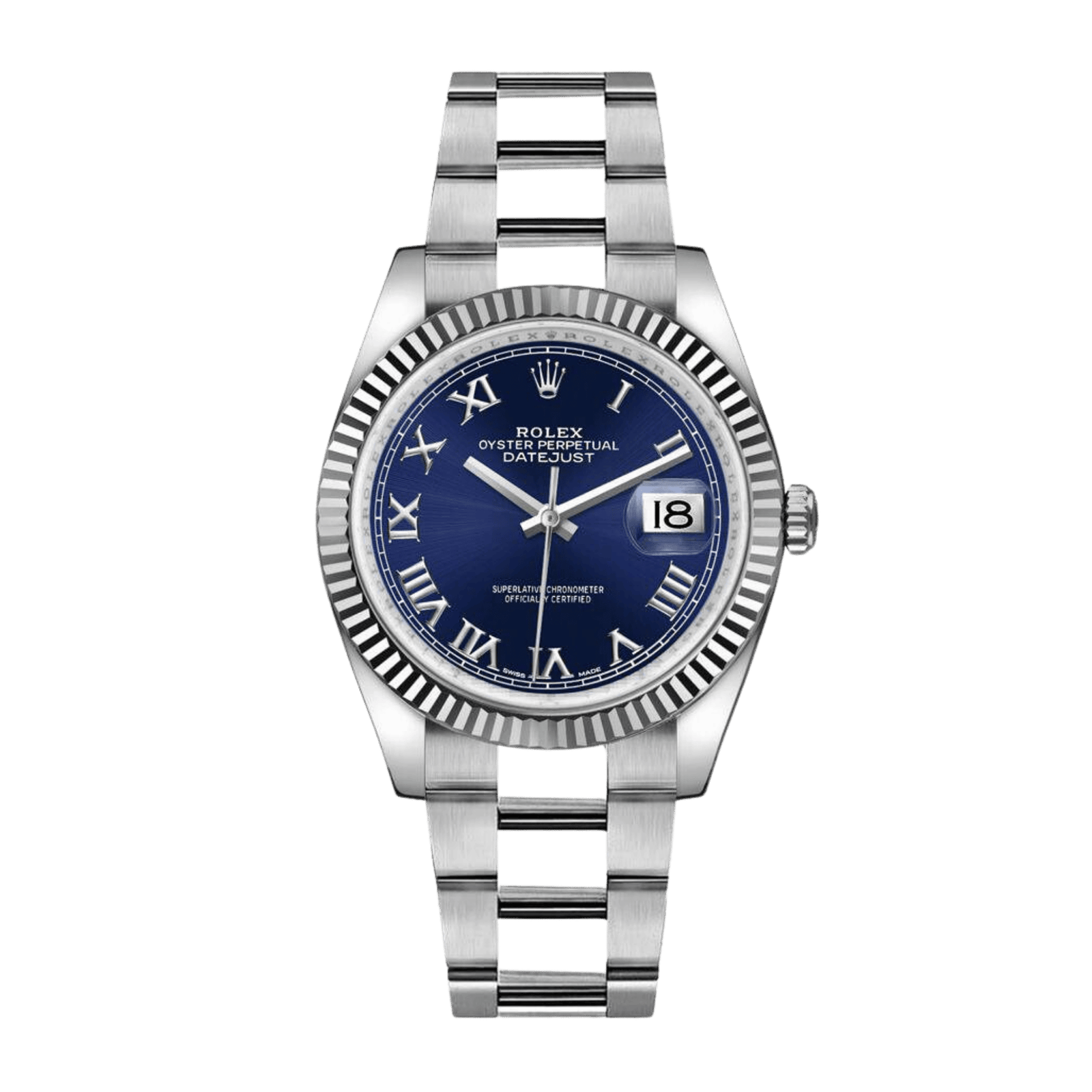 Discover the sophistication of the Rolex Datejust Steel Blue Dial 36mm ref. 116234-0133. This elegant timepiece features a striking blue dial complemented by Roman numeral hour markers, delivering a classic yet contemporary look. Powered by the self-winding Caliber 3135 movement, the watch guarantees a 48-hour power reserve and is a certified chronometer for precise timekeeping. The cyclops date window at the 3 o’clock index enhances functionality while maintaining the watch’s refined aesthetic. Housed in a 36mm stainless steel case with a luxurious white gold bezel, this model embodies durability and style. The Oyster-style bracelet, made from stainless steel, offers comfort and is secured with a folding clasp for a secure fit. With a water resistance of up to 100 meters and a scratch-resistant sapphire crystal, the Rolex Datejust is designed for everyday wear and special occasions alike, making it a valuable addition to any collection.Read More