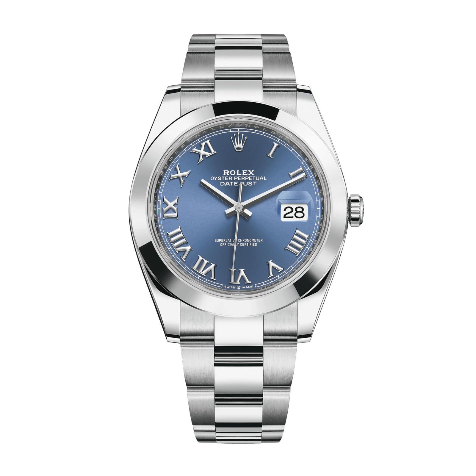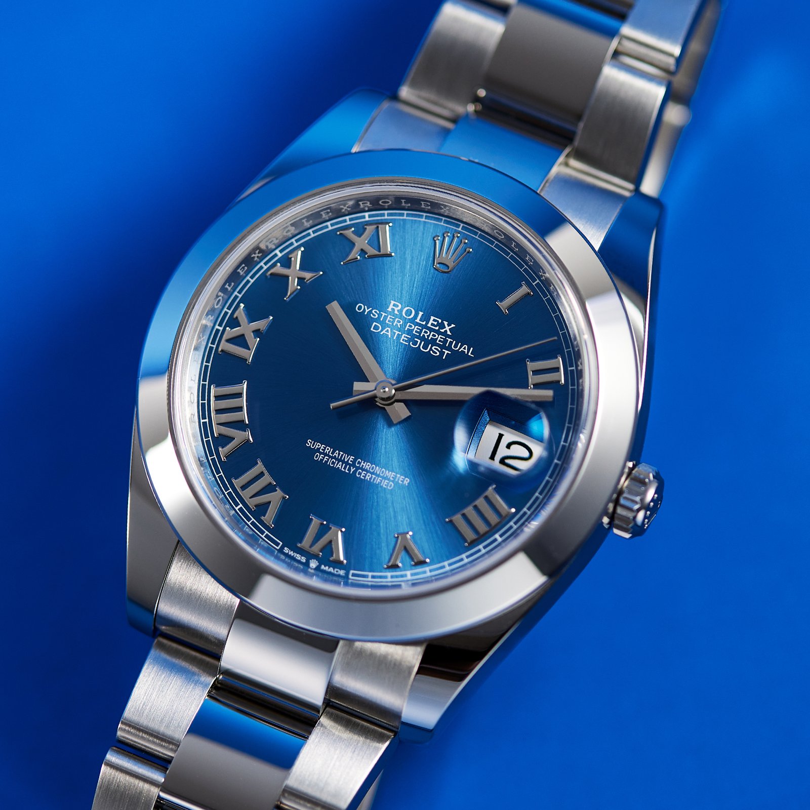 Experience the elegance of the Rolex Datejust 41 ref. 126300-0017 in Oystersteel with a striking blue dial. This 41mm timepiece features an azzurro-blue sunray dial that reflects light beautifully, creating a subtle glow that shifts with wrist movement. The dial is enhanced by Roman numeral markers, ensuring clear readability. Crafted from Rolex’s proprietary Oystersteel, known for its exceptional resistance to corrosion, this watch maintains its polished finish in any environment. The robust stainless steel case is complemented by a matching Oyster bracelet, designed for comfort and durability. Equipped with the self-winding Caliber 3235 movement, the Datejust offers a remarkable 70-hour power reserve and is a certified chronometer, ensuring precision. The watch is also water-resistant up to 100 meters, making it versatile for daily wear. The Rolex Datejust 41 is a perfect blend of style and functionality, ideal for the modern individual.Read More