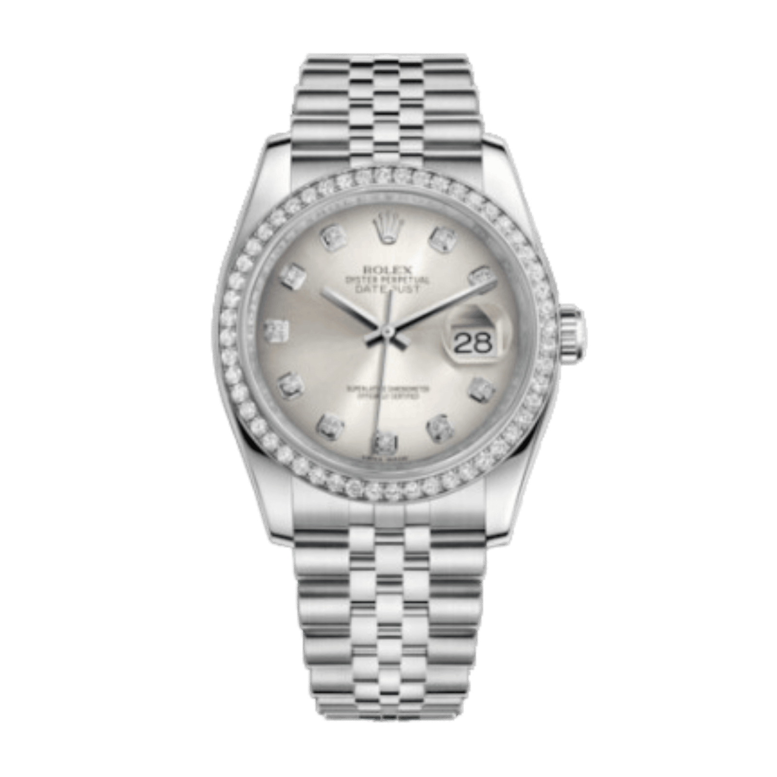 Introducing the Rolex Datejust Steel Diamond Jubilee Silver Dial 36mm, ref. 116244-0001. This elegant timepiece blends classic design with modern sophistication. The 36mm stainless steel case features a luxurious white gold and diamond bezel, enhancing its refined aesthetic. The silver dial is adorned with applied diamond indexes, offering a striking contrast and improved legibility. Powered by the self-winding Caliber 3135 movement, this watch provides a power reserve of 48 hours and is chronometer-certified for precision. The scratch-resistant sapphire crystal ensures durability, while the watch is water-resistant up to 100 meters, making it versatile for daily wear. The stainless steel bracelet, fitted with a secure folding clasp, offers comfort and style. With its combination of luxury and functionality, the Rolex Datejust is ideal for both formal occasions and everyday use, making it a must-have for any discerning watch enthusiast.Read More