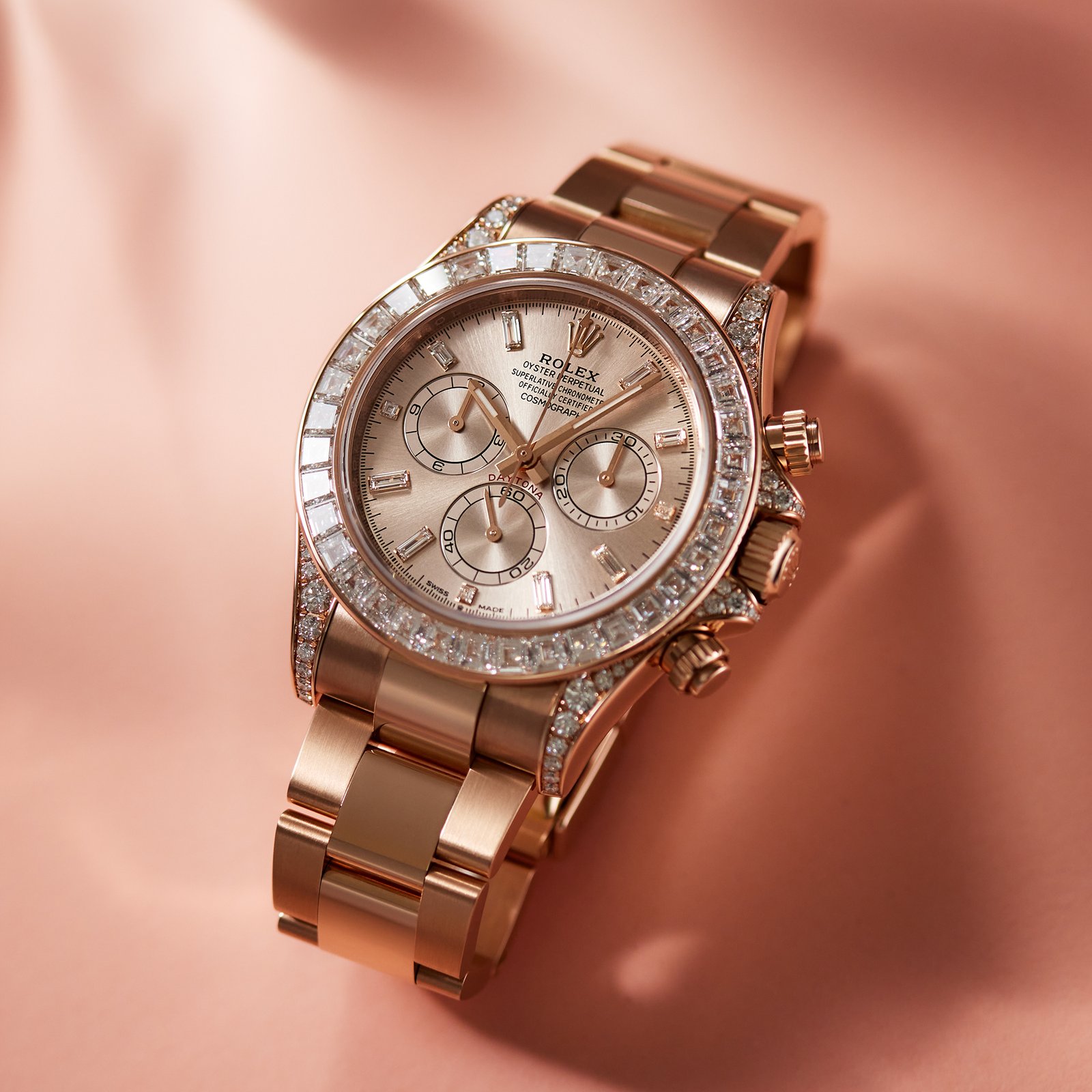 The Daytona Rose Gold Diamond Pink Dial ref. 116515LN-0061 is a dazzling testament to luxury and precision. This extraordinary timepiece showcases a radiant 18k Everose gold case with a pink dial adorned with hour markers set with brilliant-cut diamonds, exuding opulence and glamour. The captivating pink dial features contrasting black sub-dials, offering a striking visual appeal. Powered by the renowned automatic movement, this watch guarantees exceptional accuracy and reliability. The rose gold Oysterflex rubber strap adds to its allure and ensures a comfortable fit. With a 40mm case diameter and a water resistance of up to 100 meters, this watch effortlessly combines style with functionality. The Daytona Rose Gold Diamond Pink Dial ref. 116515LN-0061 is a true masterpiece that will elevate any ensemble to new heights of sophistication.