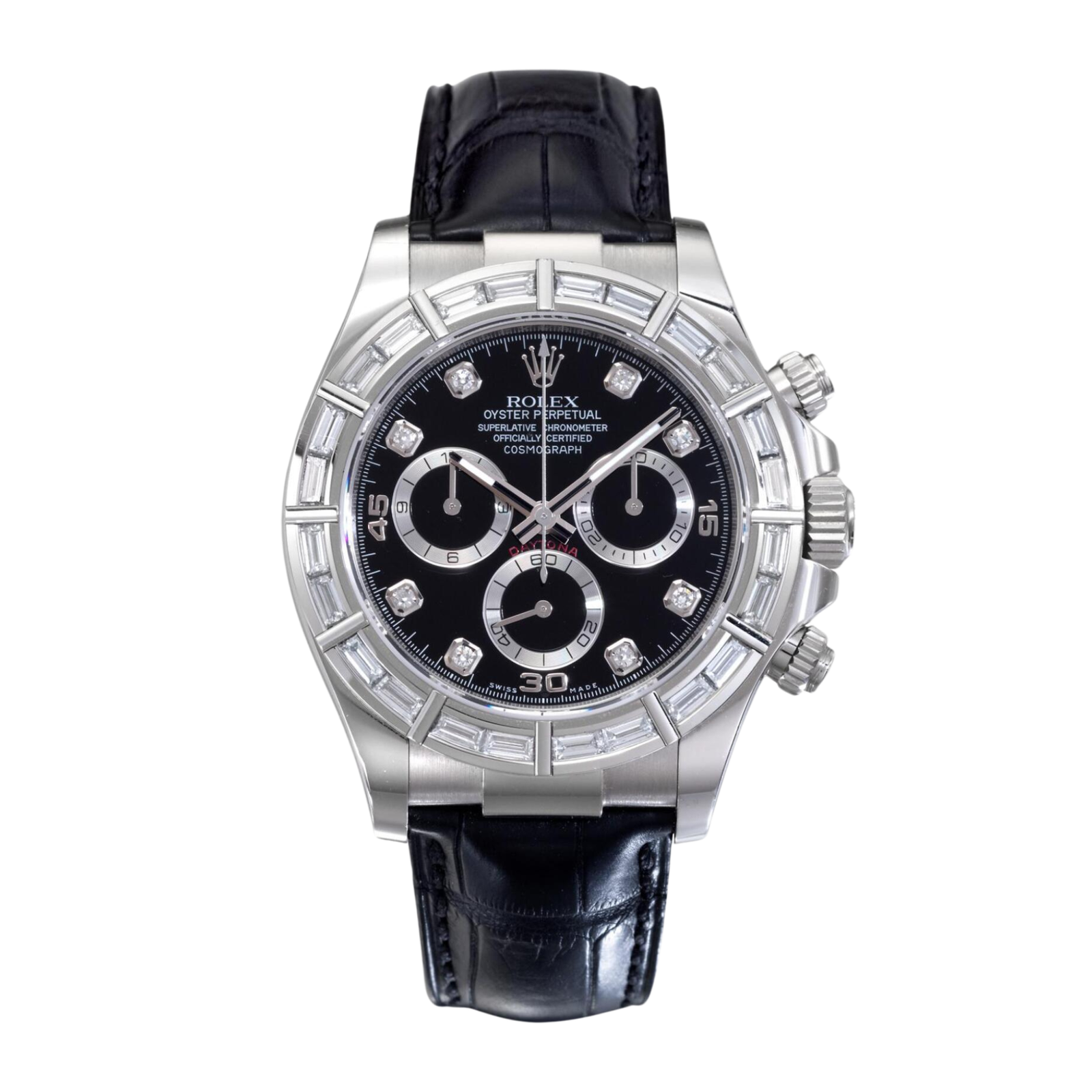 Introducing the Rolex Daytona White Gold Diamond Black Dial, a luxurious timepiece that marries sophisticated design with high-performance functionality. Launched in 2000, this 40mm watch is part of the legendary Daytona collection, celebrated for its ties to motorsport and precision engineering. The striking black dial features diamond-applied indexes that enhance its elegance, while the chronograph subdials are lined with a silvery white, providing a vivid contrast. The bezel, adorned with an array of dazzling diamonds, elevates the watch to a new level of opulence, making it a true statement piece. Crafted from white gold, this Daytona is not just about looks; it’s powered by the self-winding Caliber 4130 movement, offering a 72-hour power reserve and water resistance up to 100 meters. With functions that include hours, minutes, seconds, and chronograph capabilities, it’s as functional as it is beautiful. Perfect for formal occasions or luxury outings, the Rolex Daytona White Gold Diamond Black Dial is the ultimate accessory for the discerning individual, blending refinement with exceptional performance.Read More