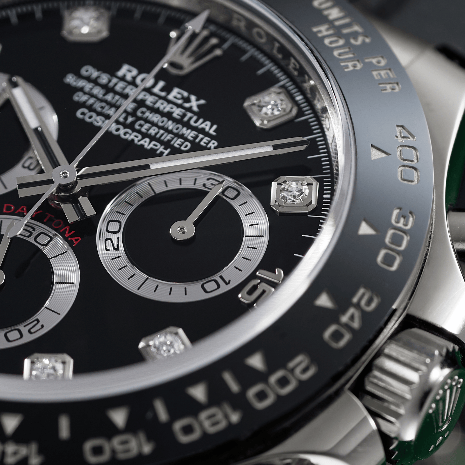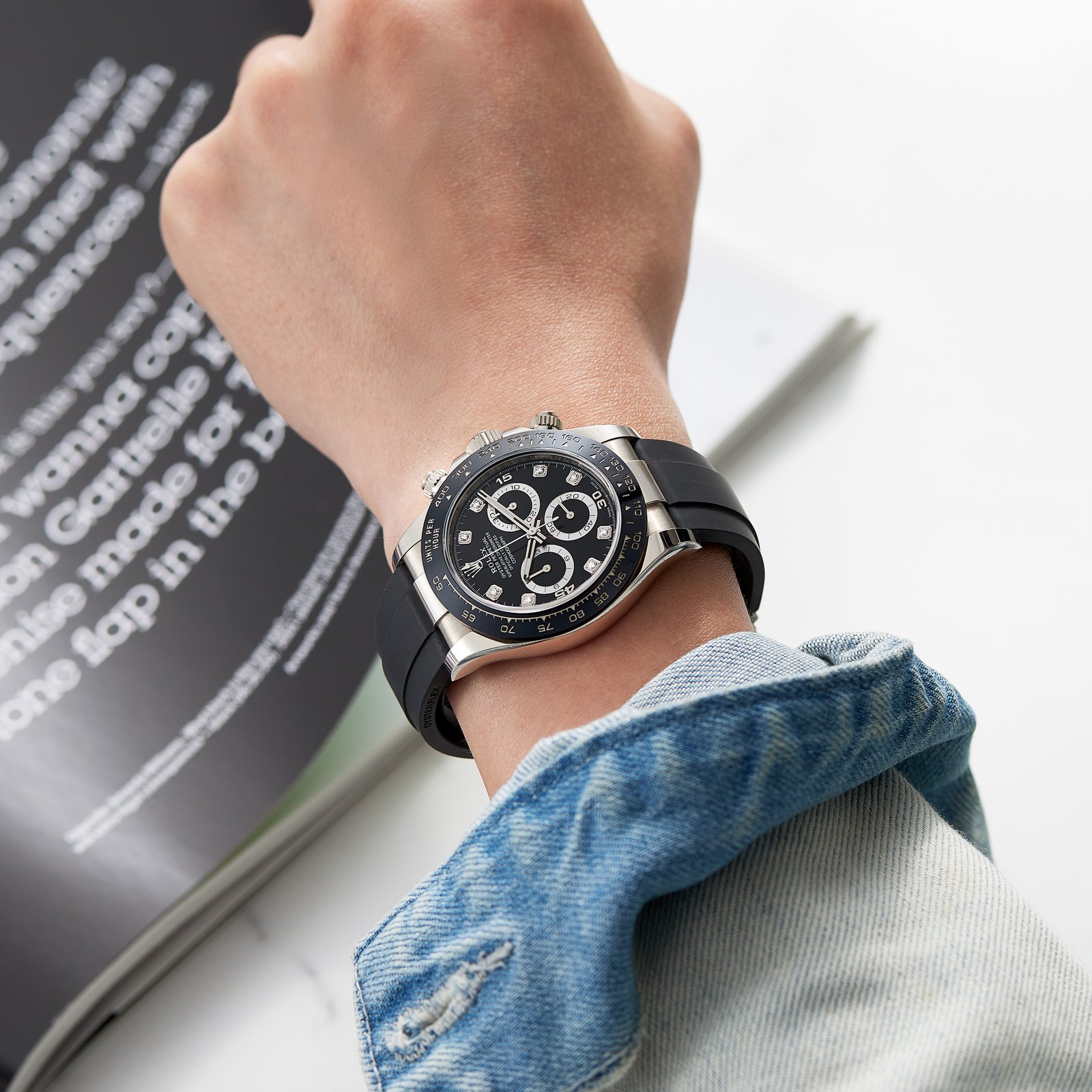 Discover the elegance of the Rolex Daytona, a legendary chronograph that marries performance with luxury. Launched in 2019, this exquisite timepiece is crafted from white gold and features a striking black dial adorned with applied diamond indexes, making it a standout accessory for any occasion. The 40mm case is complemented by a durable ceramic bezel, ensuring scratch resistance while enhancing its sporty look. Powered by the self-winding Caliber 4130 movement, the Daytona boasts a remarkable power reserve of 72 hours, allowing for precision timing whether you’re on the track or enjoying a night out. With a water resistance of 100 meters, this watch is versatile enough for both racing and everyday adventures. The Oysterflex strap, made from high-quality rubber, provides comfort and flexibility, while the white gold folding clasp adds a touch of sophistication. Whether you’re a motorsport enthusiast or simply appreciate fine watchmaking, the Rolex Daytona is an iconic timepiece that combines functionality with timeless style. Elevate your collection with this masterpiece of horological engineering.Read More