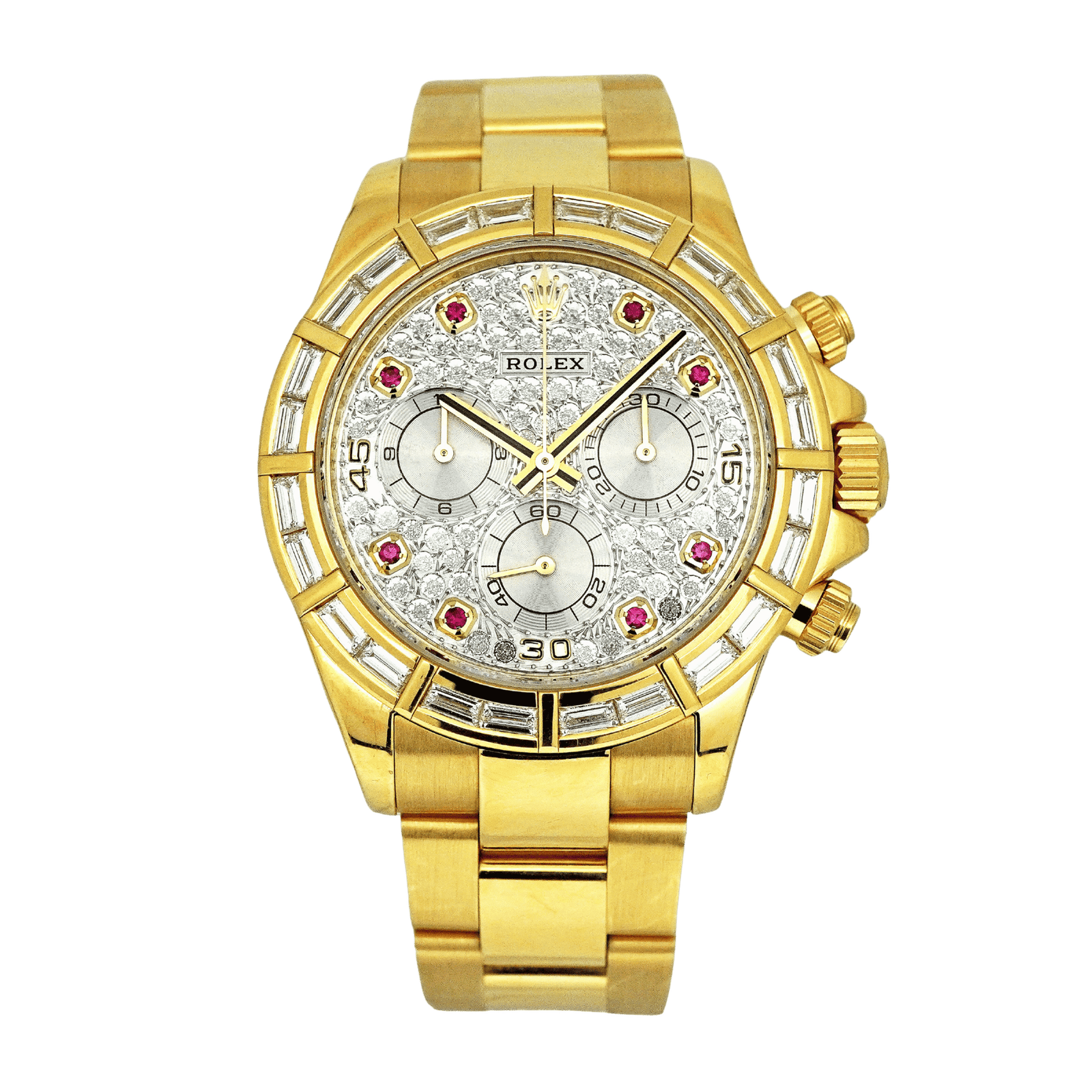 Discover the Rolex Daytona Yellow Gold Diamond Pave Dial, a bold statement in luxury and performance. This 40 mm chronograph features a striking white dial adorned with ruby hour markers, enhancing its unique character. The diamond-paved bezel adds an opulent touch, showcasing Rolex’s commitment to craftsmanship. Powered by a reliable self-winding movement, this watch offers essential functions, including hours, minutes, seconds, and chronograph capabilities, making it ideal for precision timing. The yellow gold case and bracelet exude sophistication and durability, secured with a yellow gold folding clasp for a comfortable fit. Protected by a sapphire crystal, the Daytona ref. 116568BR Pave is designed for everyday wear while maintaining its luxurious appeal. With its combination of elegant design and high-performance features, this timepiece is perfect for those who appreciate the finest in watchmaking and style.Read More