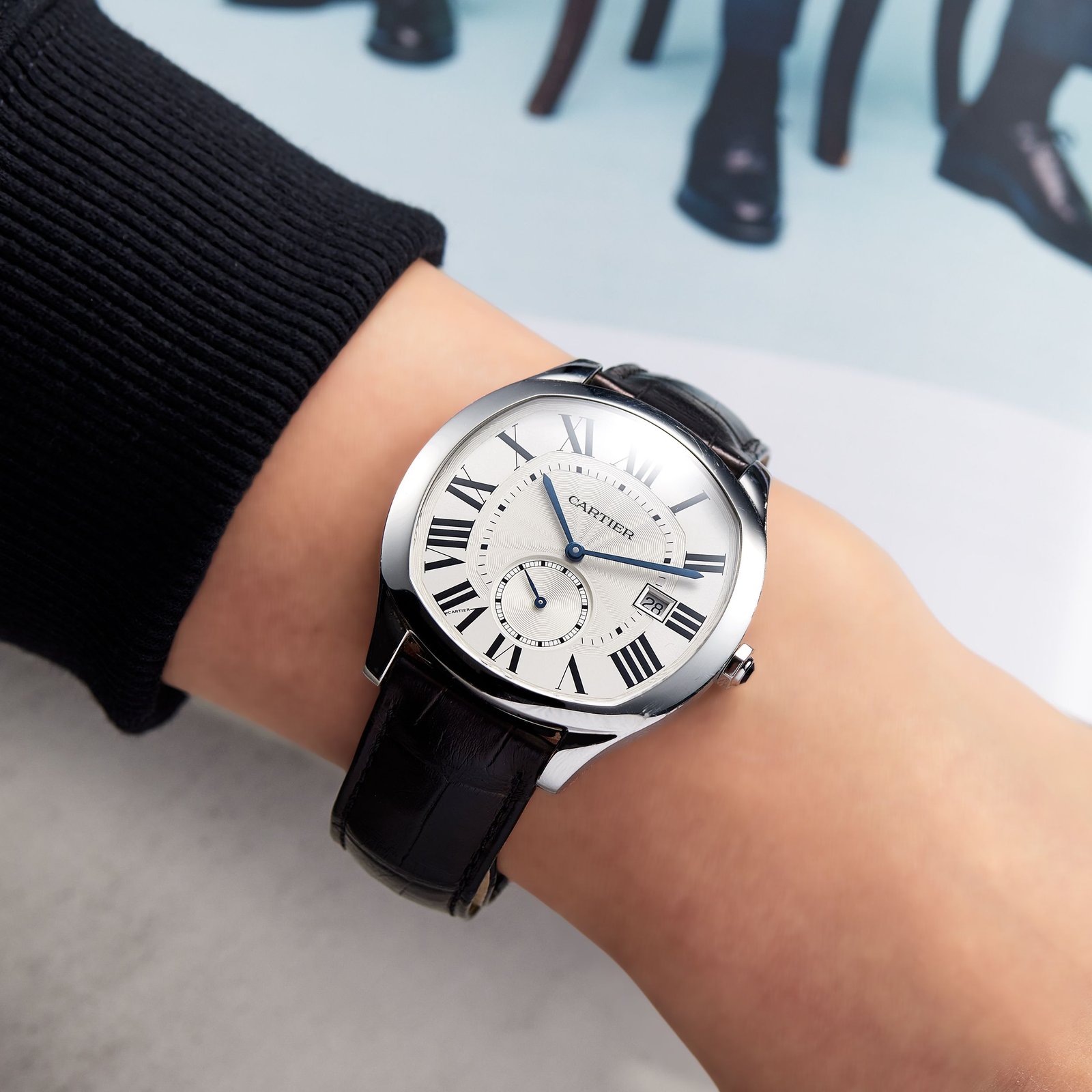 The Cartier Drive de Cartier 41 Stainless Steel Silver Dial is a captivating timepiece that seamlessly blends classic design with modern elegance. Introduced in 2016, the Drive de Cartier collection has quickly become a hallmark of the renowned Maison, capturing the hearts of discerning watch enthusiasts world wide. Crafted in gleaming stainless steel, the 41mm case of this timepiece exudes a timeless sophistication, complemented by the sleek silver dial adorned with bold Roman numeral hour markers. The sapphire crystal ensures exceptional durability and clarity, protecting the self-winding Calibre 1904-PS MC movement within. With a power reserve of 48 hours, this timepiece delivers reliable performance and accurate timekeeping, making it a versatile companion for daily wear. While the water resistance of 30 meters may limit its use in water-based activities, the Cartier Drive de Cartier 41 Stainless Steel Silver Dial is perfectly suited for the demands of an active urban lifestyle. The black alligator leather strap, secured by a stainless steel folding clasp, provides a comfortable and secure fit, ensuring the Drive de Cartier maintains its refined appearance throughout the day. This timepiece seamlessly transitions from the boardroom to social gatherings, embodying Cartier’s timeless elegance and commitment to excellence in horology.Read More