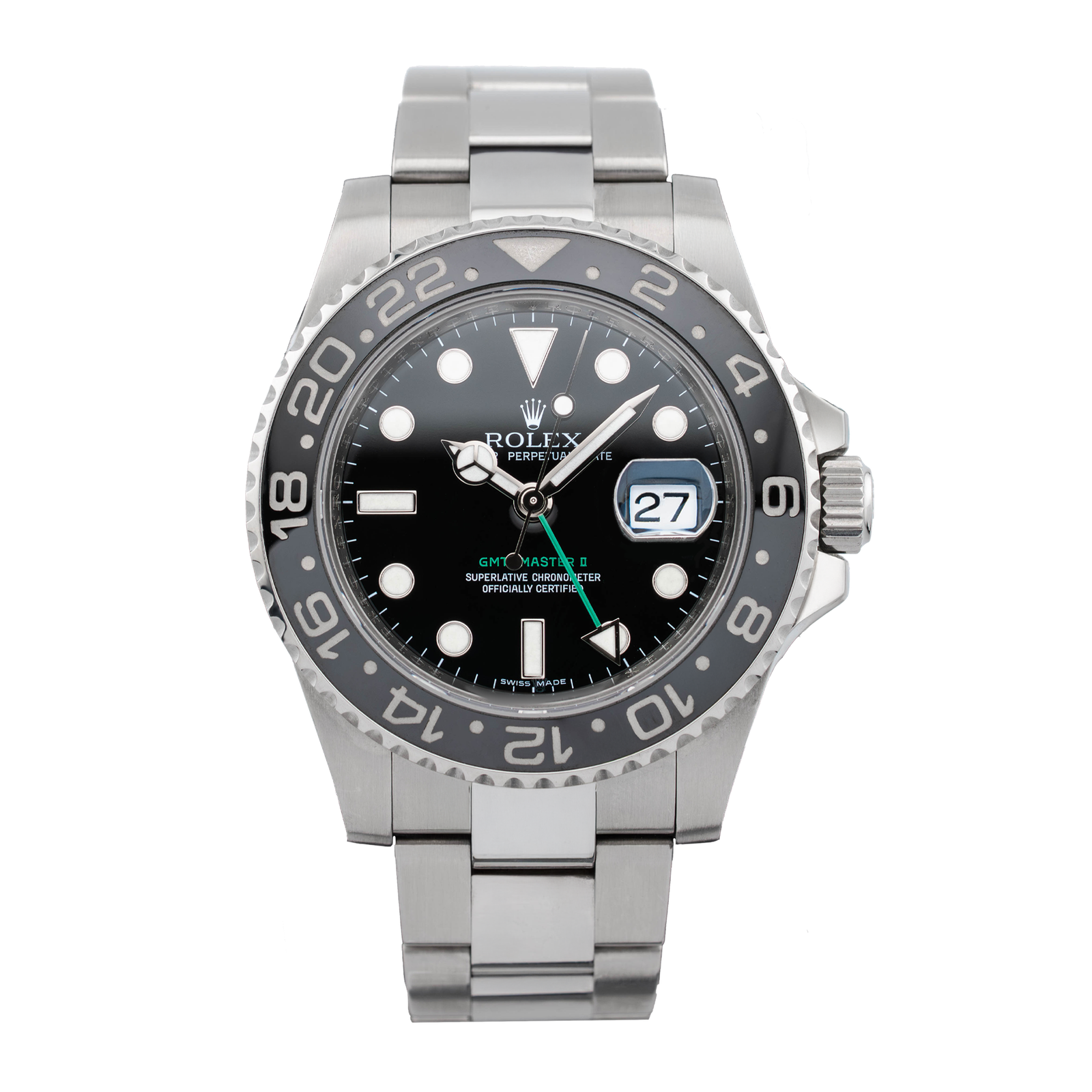 The Rolex GMT-Master II ref. 116710LN is a striking stainless-steel sports watch with a bold black dial. Measuring 40mm in diameter, the case is crafted from Rolex’s signature 904L stainless steel, renowned for its exceptional corrosion resistance and polished shine. At the heart of the watch sits the iconic GMT bezel, now made from Rolex’s proprietary Cerachrom material. This innovative ceramic bezel is highly scratch-resistant and impervious to fading from UV light exposure, ensuring the watch’s timeless good looks. The black dial features Rolex’s classic dot and arrow hour markers, providing excellent legibility against the dark backdrop. The GMT function, denoted by the green hand, allows the wearer to track a second time zone simultaneously, making the GMT-Master II ref. 116710LN a versatile tool watch for the modern jet-setter.