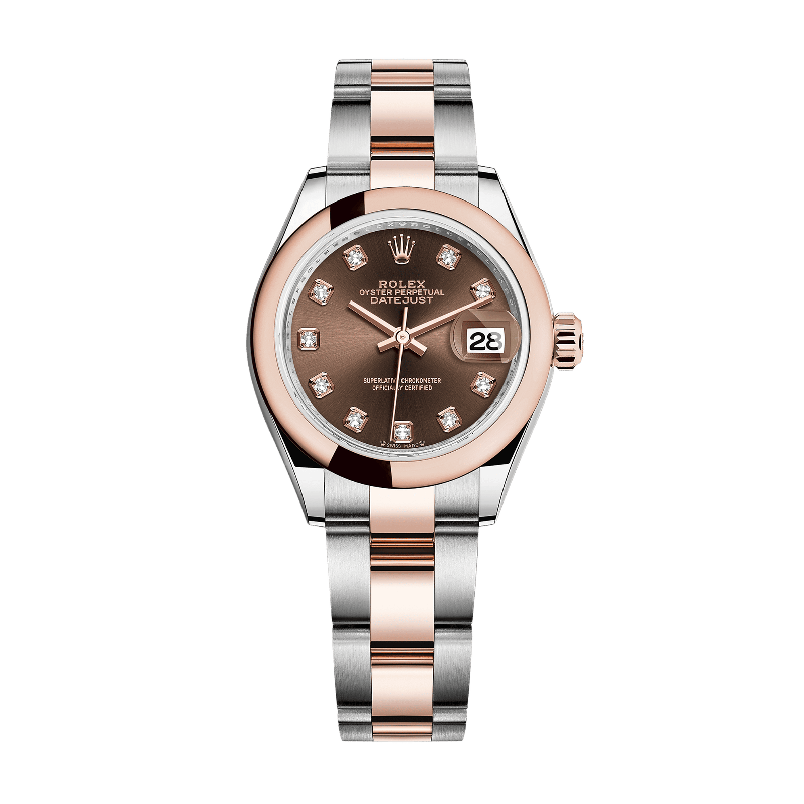 The Rolex Lady-Datejust Rose Gold & Steel Brown Dial 28mm Ref. 279161-0012 features a 28mm Oystersteel and Everose gold case with a coordinating Oyster bracelet for strength and versatility. The chocolate brown sunray dial is set with applied diamond indexes in 18 ct gold, protected by a scratch-resistant sapphire crystal for lasting clarity. Powered by the selfwinding Calibre 2236, this chronometer offers precise hour, minute, second, and date functions with a 55-hour power reserve. The Everose Rolesor construction combines durability and refined visual appeal, while the rose gold bezel enhances its signature style. The Oyster bracelet includes an Oysterclasp with Easylink extension, allowing quick bracelet adjustment for optimal fit. Water resistant to 100 meters, this Lady-Datejust stands out for its harmonious blend of robust engineering, elegant material combinations, and refined diamond accents, making it a practical and distinctive choice for everyday wear.Read More