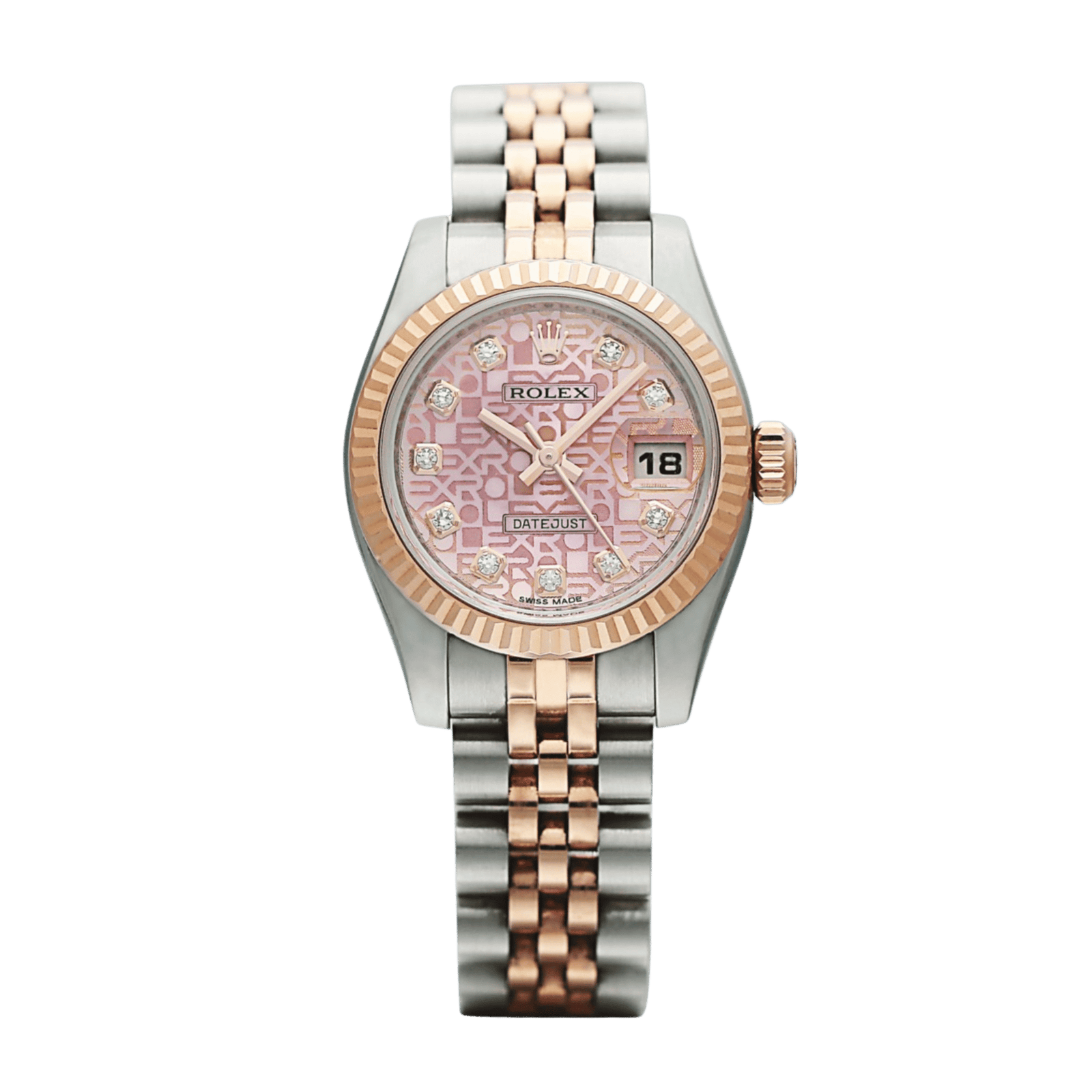 Introducing the Rolex Lady-Datejust Rose Gold & Steel Jubilee Pink Computer Dial 26mm, ref. 179171. This refined timepiece seamlessly blends elegance with functionality. Featuring a striking pink computer dial, the watch is adorned with diamond-applied indexes, adding a luxurious touch. The rose gold fluted bezel complements the stainless steel case, which measures 26 mm in diameter, creating a harmonious contrast. The Jubilee bracelet, with its rose gold middle links, ensures both style and comfort. Powered by the self-winding Calibre 2235 movement, this watch offers a power reserve of up to 48 hours and is certified as a chronometer for precise timekeeping. With water resistance up to 100 meters, it is suitable for a variety of occasions. The sapphire crystal enhances durability and visibility. The Lady-Datejust embodies classic Rolex craftsmanship and modern aesthetics, making it an ideal choice for those who appreciate luxury and practicality.Read More