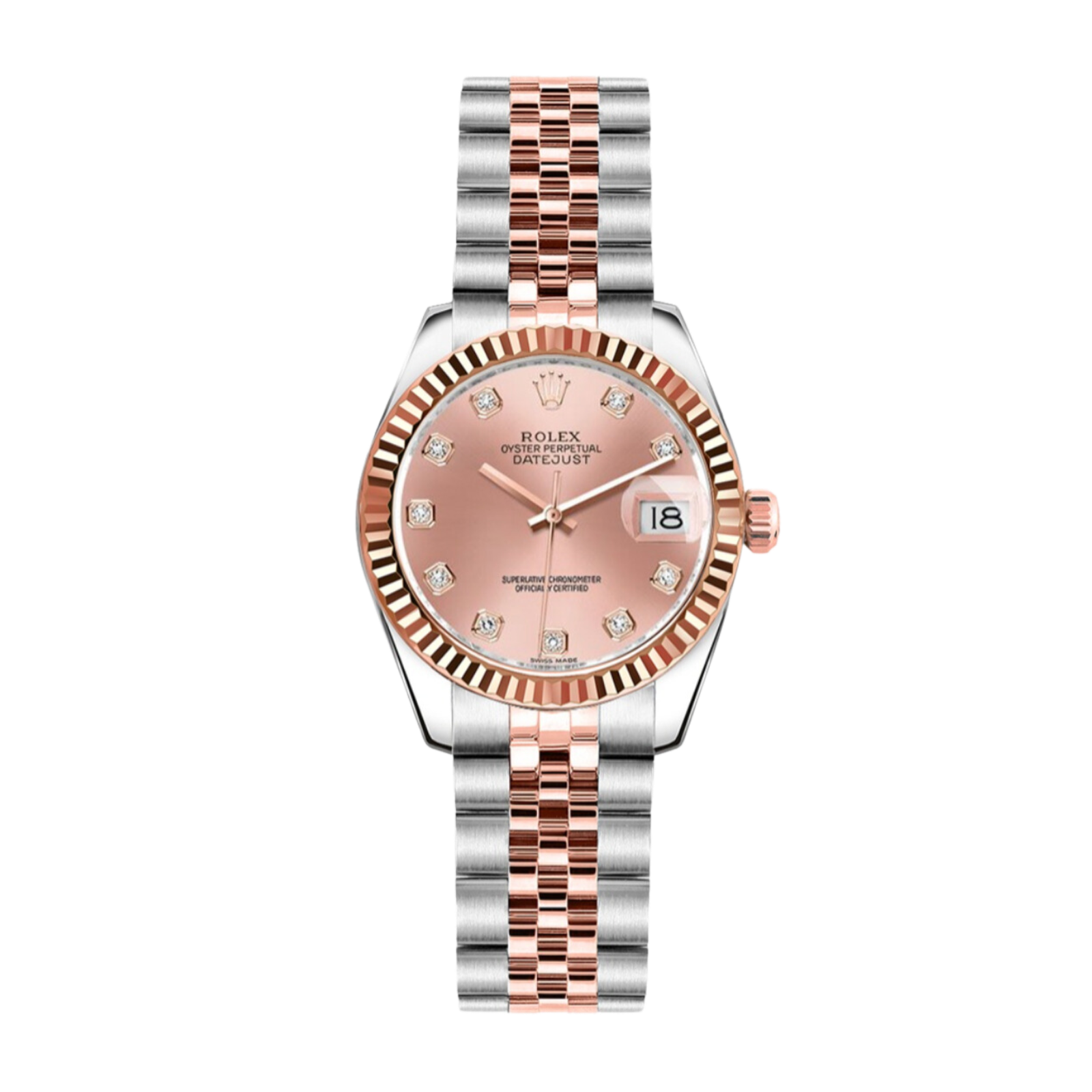 Discover the Rolex Lady-Datejust 26mm ref. 179171-0018, a refined timepiece for the modern woman. This watch features a stunning pink dial with applied diamond indexes, providing a touch of luxury and elegance. The 26mm stainless steel case is complemented by a rose gold bezel, enhancing its overall appeal. Powered by the Calibre 2235 movement, the Lady-Datejust offers a reliable 48-hour power reserve and self-winding functionality. Its water resistance of up to 100 meters ensures durability for everyday wear. The Jubilee bracelet, featuring center links in rose gold, combines comfort with sophistication, secured by a stainless steel folding clasp. This design not only enhances the watch’s aesthetic but also provides a secure fit. The Rolex Lady-Datejust is ideal for those who appreciate quality craftsmanship and want a versatile accessory that transitions seamlessly from day to night. Experience the perfect blend of functionality and style with this exceptional timepiece.Read More