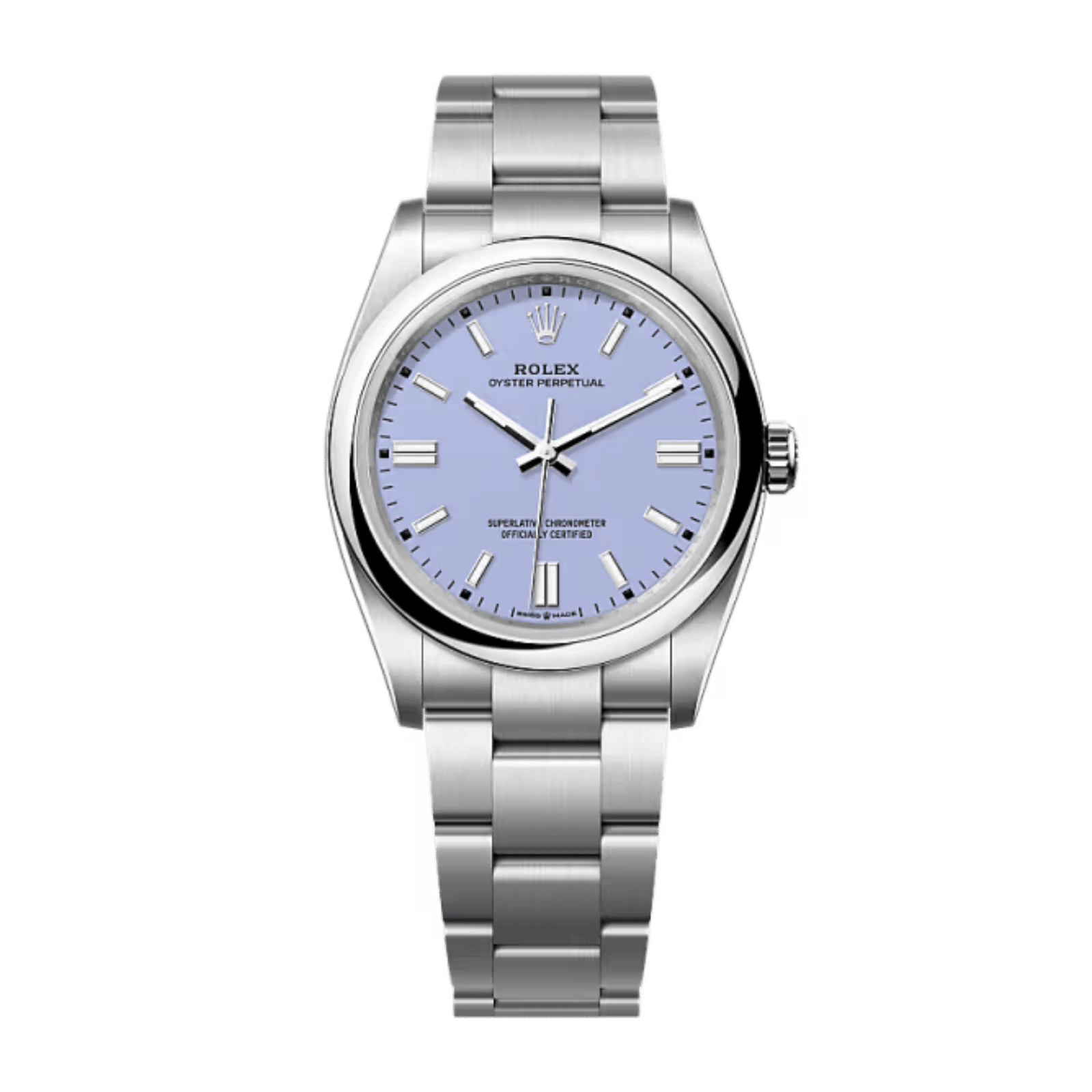 The Rolex Oyster Perpetual 36 ref. 126000-0013 in Oystersteel with a lavender dial introduces a playful yet refined colorway to one of Rolex’s most enduring watch lines. Released as part of the 2023 dial refresh, this 36mm model maintains the balanced proportions of the Oyster Perpetual series while offering a distinctive aesthetic through its soft purple hue—a tone not often seen in the brand’s catalog.The watch features a corrosion-resistant Oystersteel case, a smooth domed bezel, and a brushed Oyster bracelet with polished center links and Easylink extension. Inside, the in-house calibre 3230 automatic movement offers a 70-hour power reserve and -2/+2 seconds-per-day accuracy, certified by Rolex’s Superlative Chronometer standard. Water resistance is rated to 100 meters, making this a highly versatile daily wearer.For collectors seeking a modern Rolex with character, the 126000-0013 stands apart with its contemporary color and robust specification.Read More