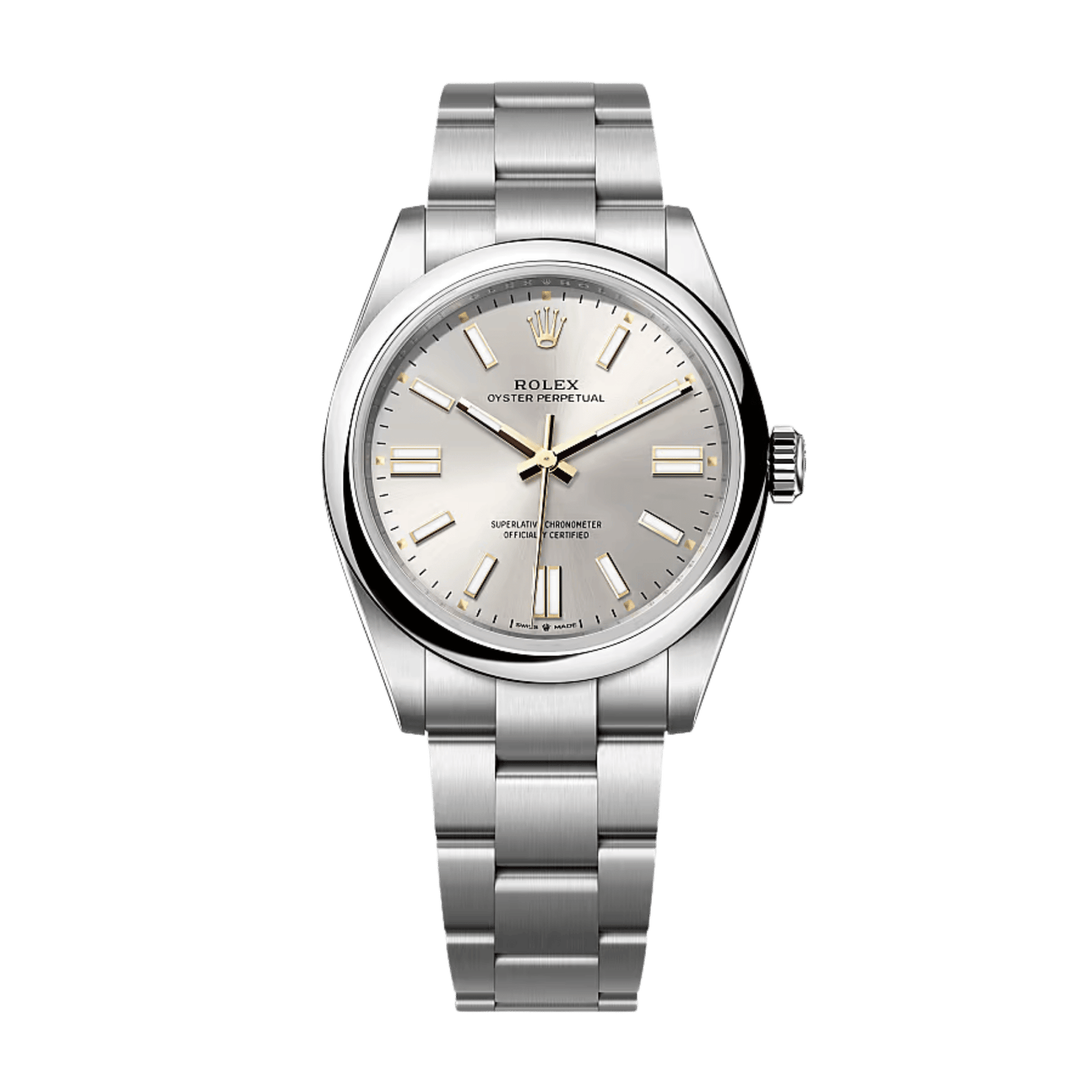 Introduced in 2025, this iteration features a 41mm Oystersteel case with polished bezel and Twinlock screw-down crown, reinforcing Rolex’s emphasis on reliable durability and daily wear. Its silver sunray dial is accented only with applied hour markers and baton hands, remaining true to the collection’s elemental purity. Inside beats the calibre 3230 – a self-winding movement offering a 70-hour power reserve, Rolex’s proprietary Chronergy escapement, and 100m of water-resistance.