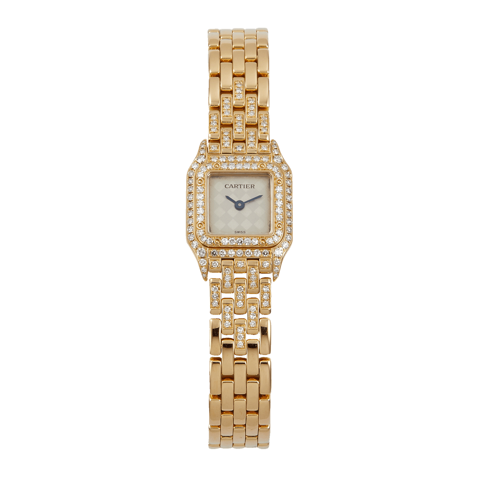 The Cartier Mini Panthere Yellow Gold Diamond White Dial ref. WF3164FR is a vintage jewel in the prestigious lineage of Cartier timepieces. This elegant watch exudes luxury with its 18k yellow gold case, encrusted with brilliant diamonds that sparkle with every turn of the wrist. Featuring a pristine white dial, this model is adorned with delicate blued-steel hands, offering a timeless look that is instantly recognizable as Cartier. The compact and feminine design of the Mini Panthere makes it an exquisite accessory for any occasion, seamlessly blending with both daywear and evening attire. The bracelet, also crafted in 18k yellow gold, showcases a sophisticated link design that is both comfortable and secure on the wrist. This vintage piece is protected by a scratch-resistant sapphire crystal, ensuring it remains a treasured part of any collection for years to come. Perfect for those who appreciate the allure of vintage luxury watches, this Cartier piece is a testament to craftsmanship and timeless elegance