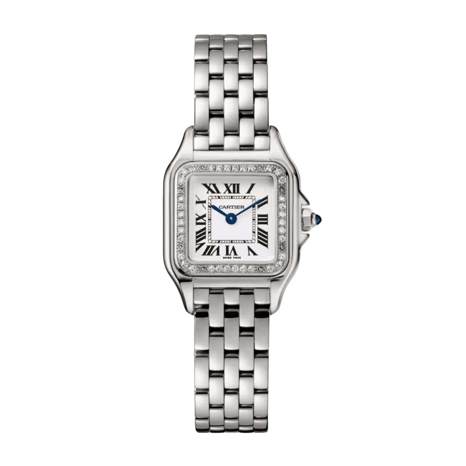 The Cartier Panthère de Cartier Steel Diamond Silver Dial 30mm Ref. W4PN0016 presents an elegant 23 x 30 mm stainless steel case with a polished bezel set with brilliant-cut diamonds, merging classic Cartier design with a touch of luxury. Powered by a reliable quartz movement, this small model features a silvered dial adorned with Roman numerals and blued-steel sword-shaped hands, embodying the spirit of refined sophistication. The crown is set with a synthetic blue spinel, enhancing its iconic silhouette. The durable steel bracelet, secured by a deployment clasp, ensures comfort and longevity, while a scratch-resistant sapphire crystal provides protection. Water resistance to 30 meters adds practicality for daily wear. The Panthère de Cartier’s jewelry-inspired design, enhanced by the diamond-set bezel, delivers a striking watch that is recognized instantly and admired for its distinctive style and technical precision.Read More