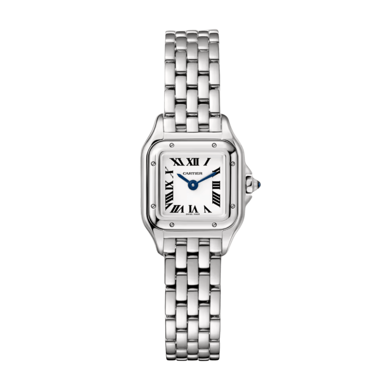 The Cartier Panthère de Cartier Steel Silver Dial 25mm Ref. WSPN0012 presents a refined mini model with a 25mm x 19mm stainless steel case and matching bracelet, offering a sleek and comfortable fit for daily wear. Driven by a reliable quartz movement, this watch features a silvered dial adorned with traditional Roman numerals and blued-steel sword-shaped hands for the signature Cartier aesthetic. The octagonal crown is set with a blue synthetic spinel, adding a distinct touch of elegance. A scratch-resistant sapphire crystal shields the dial, and the deployment clasp ensures secure closure. With a thickness of just 6mm and water resistance up to 30 meters, it is practical as well as stylish. The Panthère de Cartier is celebrated for its distinctive design, making it an enduring favorite for those seeking a blend of jewelry-inspired allure and functional timekeeping in a compact form.Read More