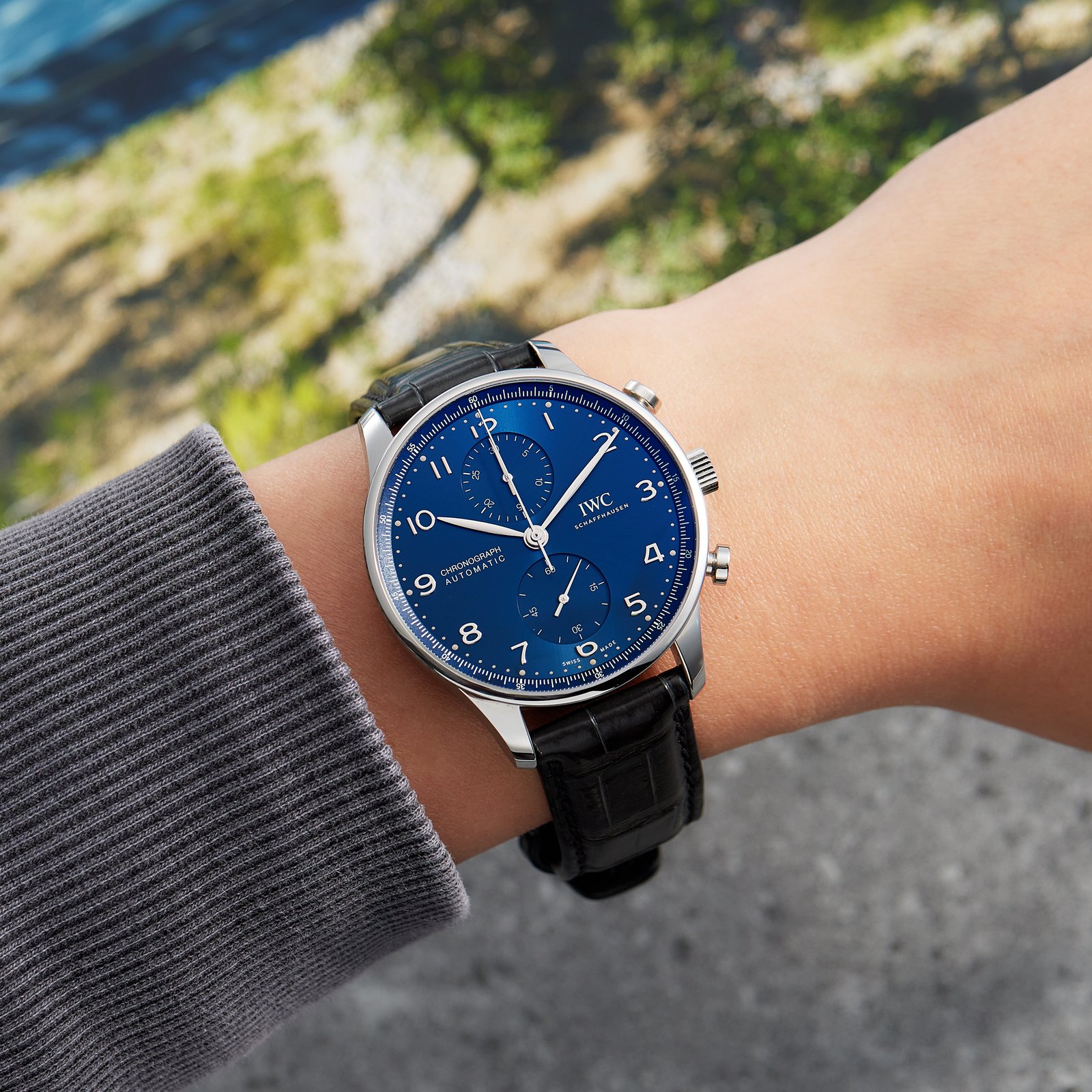 The IWC Portugieser collection boasts a rich heritage dating back to the 1930s, originally created for visionary Portuguese businessmen who recognized the potential of large wristwatches. Renowned for their clean and minimalist dials, generous case sizes, and exceptional mechanical movements, IWC Portugieser watches have earned a reputation as horological masterpieces. The remarkable Portugieser 41 Chronograph Stainless Steel Blue Dial ref. IW371606 pays homage to the esteemed collection’s prestigious professional history while offering a unique and distinct experience. Crafted from stainless steel, the refined 41mm case exudes understated elegance, rendering it suitable for both formal occasions and everyday wear. The captivating blue dial, adorned with polished silver-tone hands and hour markers, provides a striking contrast and enhances legibility. The chronograph function, indicated by sub-dials positioned at 6 o’clock and 12 o’clock, enables precise timekeeping and effortless measurement of elapsed intervals. Driving this exceptional timepiece is the reliable and accurate IWC-manufactured caliber 69355 automatic movement. Operating at a frequency of 28,800 vibrations per hour and boasting a power reserve of 46 hours, this movement ensures optimal performance and durability. Completing the ensemble is a sleek black alligator leather strap, which adds refinement and comfort to the watch. The strap is securely fastened with a stainless steel folding clasp, ensuring a snug and comfortable fit on the wrist. This timepiece harmonizes traditional design elements with modern functionalities, offering timeless appeal and precision. Its fusion of legacy and innovation makes it an outstanding choice for watch enthusiasts who appreciate the finest craftsmanship.