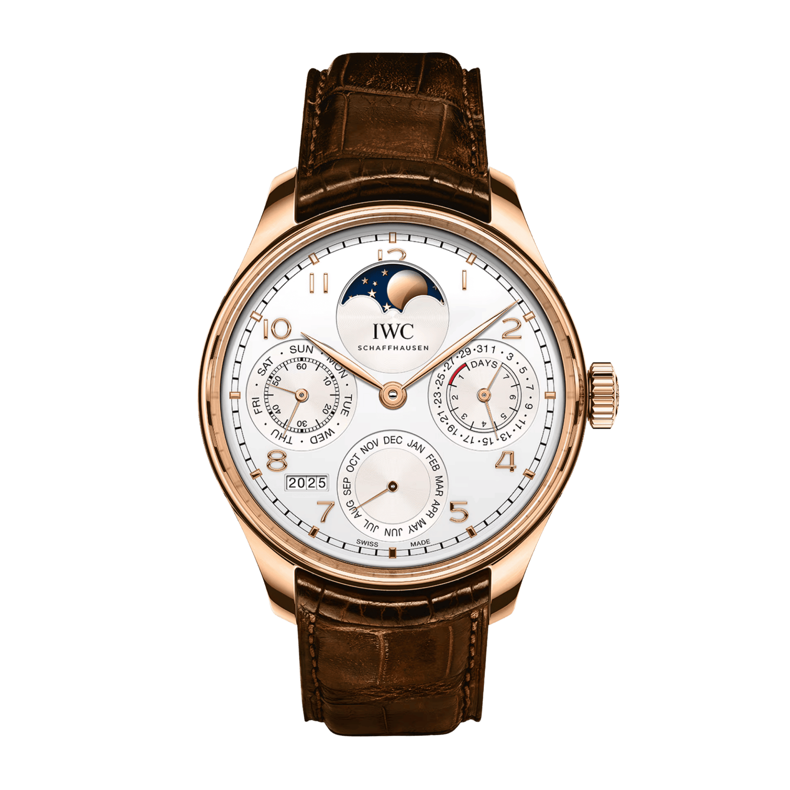 Housed in a 44mm red gold case, the IW503302 is powered by the in-house calibre 52610. This automatic movement features IWC’s Pellaton winding system and has twin barrels delivering an impressive 7-day power reserve. The perpetual calendar complication includes displays for the date, day, month, four-digit year, and moonphase – the latter in a traditional single-window layout. The whole mechanism is adjusted via the crown alone. Water resistance is rated to 30m, and the watch is accompanied by a brown Santoni alligator leather strap.