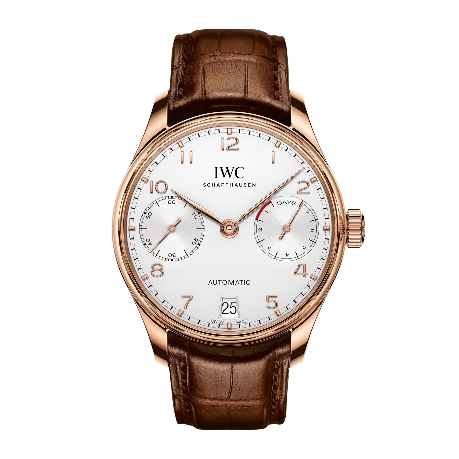 Discover the IWC Portugieser Rose Gold Silver Dial, reference IW500701. This 42mm watch combines luxury and precision with an 18 ct 5N rose gold case and a striking silver-plated dial. The dial features Arabic numerals and two subdials: one for the power reserve indicator and another for the small hacking seconds, enhancing its functionality. Powered by the IWC-manufactured Calibre 52010 movement, this automatic watch boasts an impressive 168-hour power reserve, ensuring reliable performance. Its sapphire crystal, treated with anti-reflective coating, provides clarity while protecting the intricate dial. The watch is water-resistant up to 30 meters, making it suitable for everyday wear. Complemented by a dark brown alligator leather strap from Santoni, secured with a rose gold pin buckle, the IWC Portugieser combines craftsmanship with elegance, making it an exceptional choice for those who appreciate fine horology.Read More