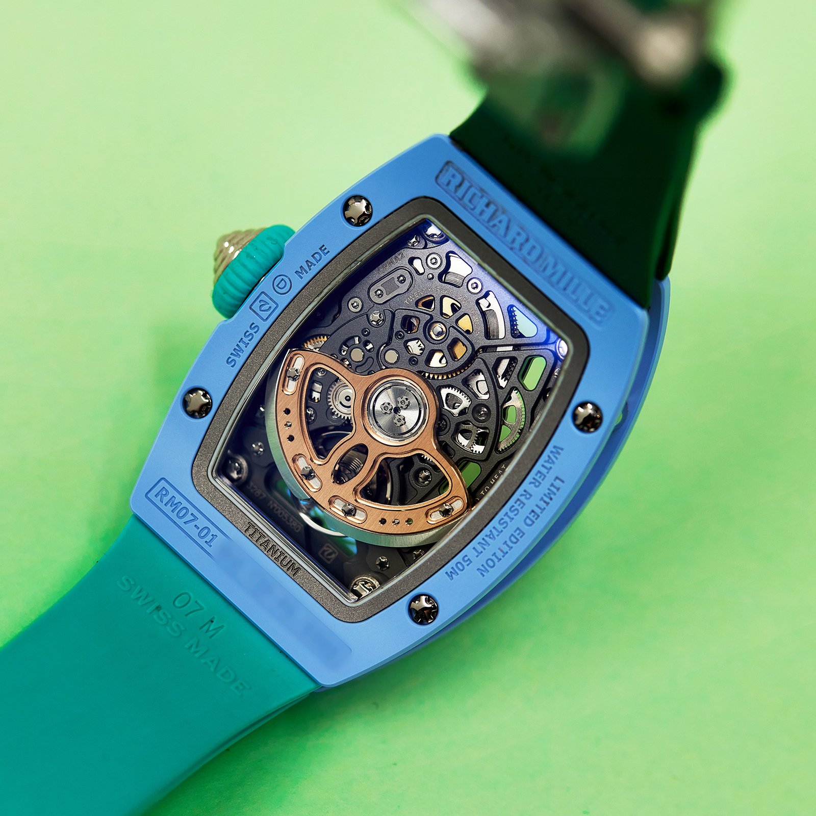 The Richard Mille RM 07-01 Pastel Blue is an elegant and playful timepiece that combines feminine charm with technical excellence. This stunning model features a 45.66mm x 31.40mm case crafted from Quartz TPT, with a soft pastel blue hue that exudes refinement. The dial showcases a beautiful geometric pattern, harmonising luxury with contemporary design. The minimalist aesthetic is complemented by polished hour markers and the signature Richard Mille skeletonised movement.Powered by the in-house automatic CRMA2 calibre, it delivers exceptional precision and features a platinum rotor for efficient winding. Paired with a colorful blue rubber strap, the RM 07-01 Pastel Blue is a perfect blend of artistry, comfort, and cutting-edge horology, designed for women who appreciate timeless elegance with a modern twist.Read More