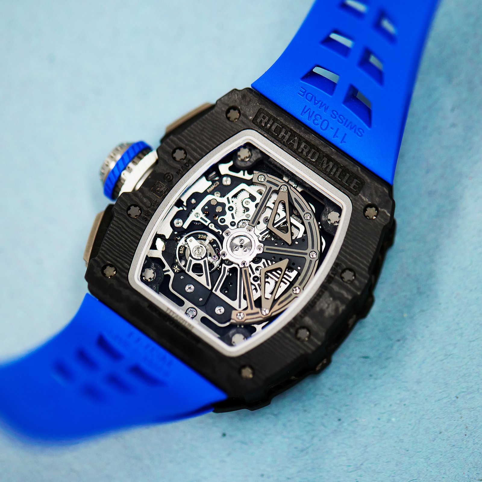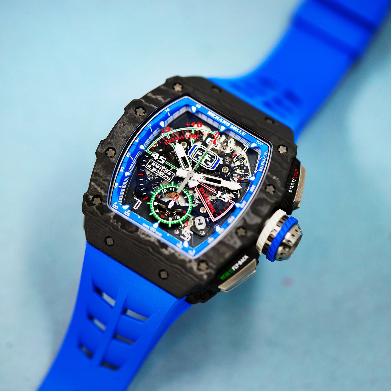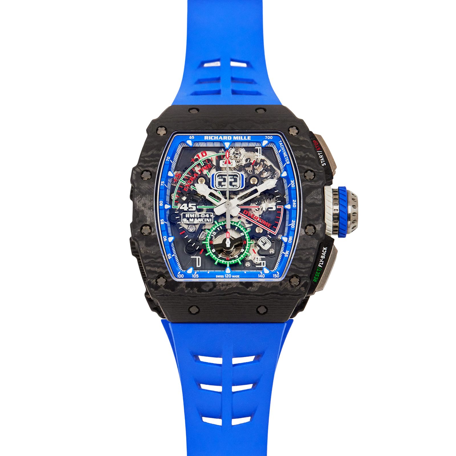 The Richard Mille RM11 collection is celebrated for its bold designs and highly functional complications, blending technical prowess with sporty aesthetics to cater to elite athletes and enthusiasts. Crafted with a 45mm carbon case, the RM11-04 features a skeletonised dial with vibrant green, yellow, and blue accents inspired by Roberto Mancini’s Italian football legacy. Its unique chronograph complication is tailored to track the two 45-minute halves of a football match, including extra time for added precision during games. Powered by the automatic RMAC3 calibre, it delivers a 55-hour power reserve and incorporates a variable-geometry rotor for efficient winding. The sporty rubber strap ensures comfort, making this timepiece as practical as it is visually striking—a true celebration of football and horology.Read More