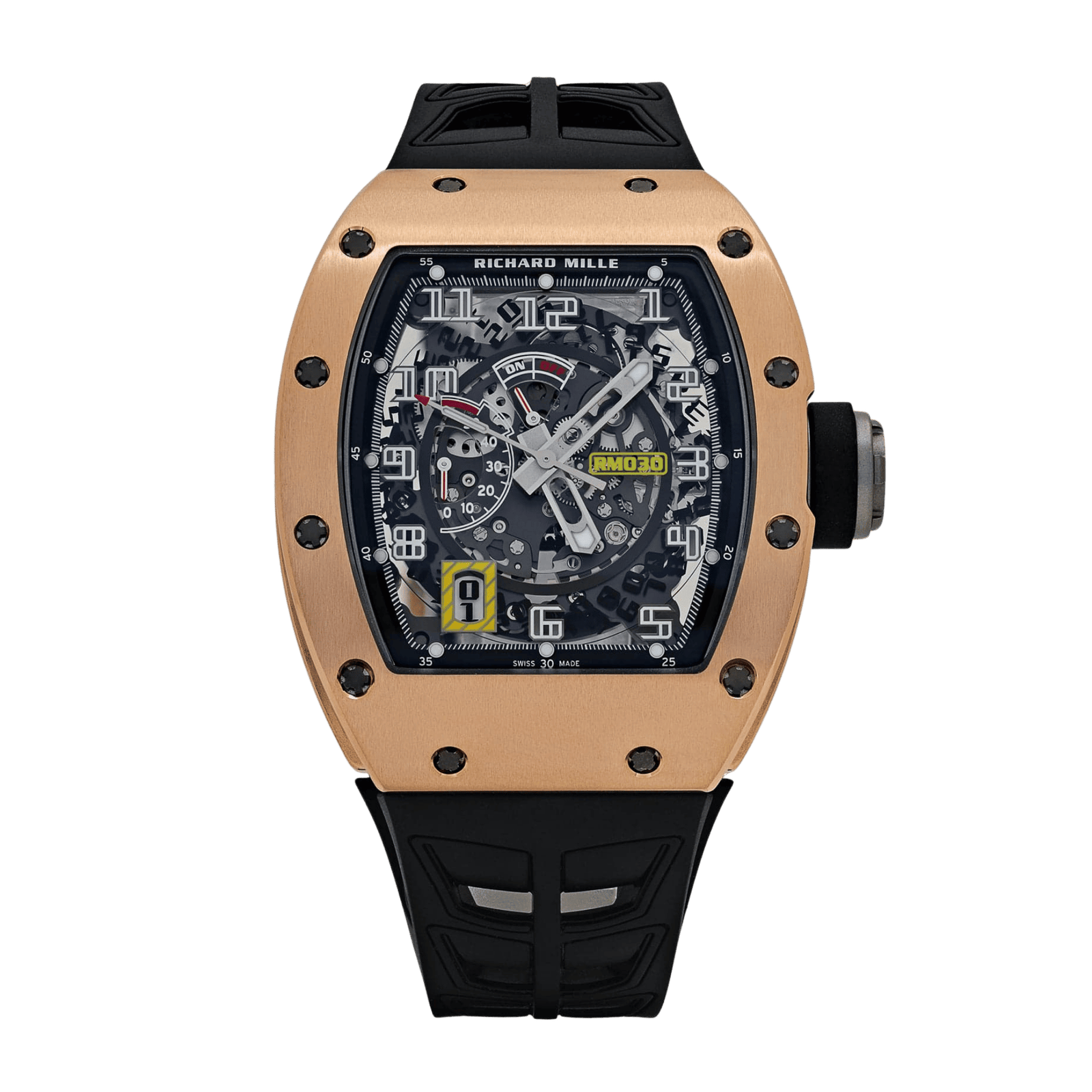 The Richard Mille RM 30 Automatic in Rose Gold is a refined blend of technical sophistication and timeless luxury. Encased in 18K rose gold with a tonneau-shaped design, the watch showcases the brand’s signature skeletonized dial, revealing the intricate RMAR1 automatic movement. Engineered with a declutchable rotor, this innovative mechanism prevents overwinding, ensuring optimal performance and a 55-hour power reserve. The combination of rose gold, titanium accents, and sapphire crystal exudes elegance, while the ergonomic design ensures exceptional comfort. Perfectly balancing form and function, the RM 30 Rose Gold is a statement timepiece for those who demand precision and exclusivity.Read More