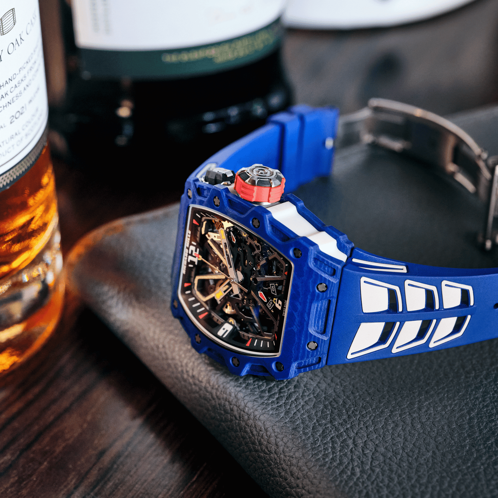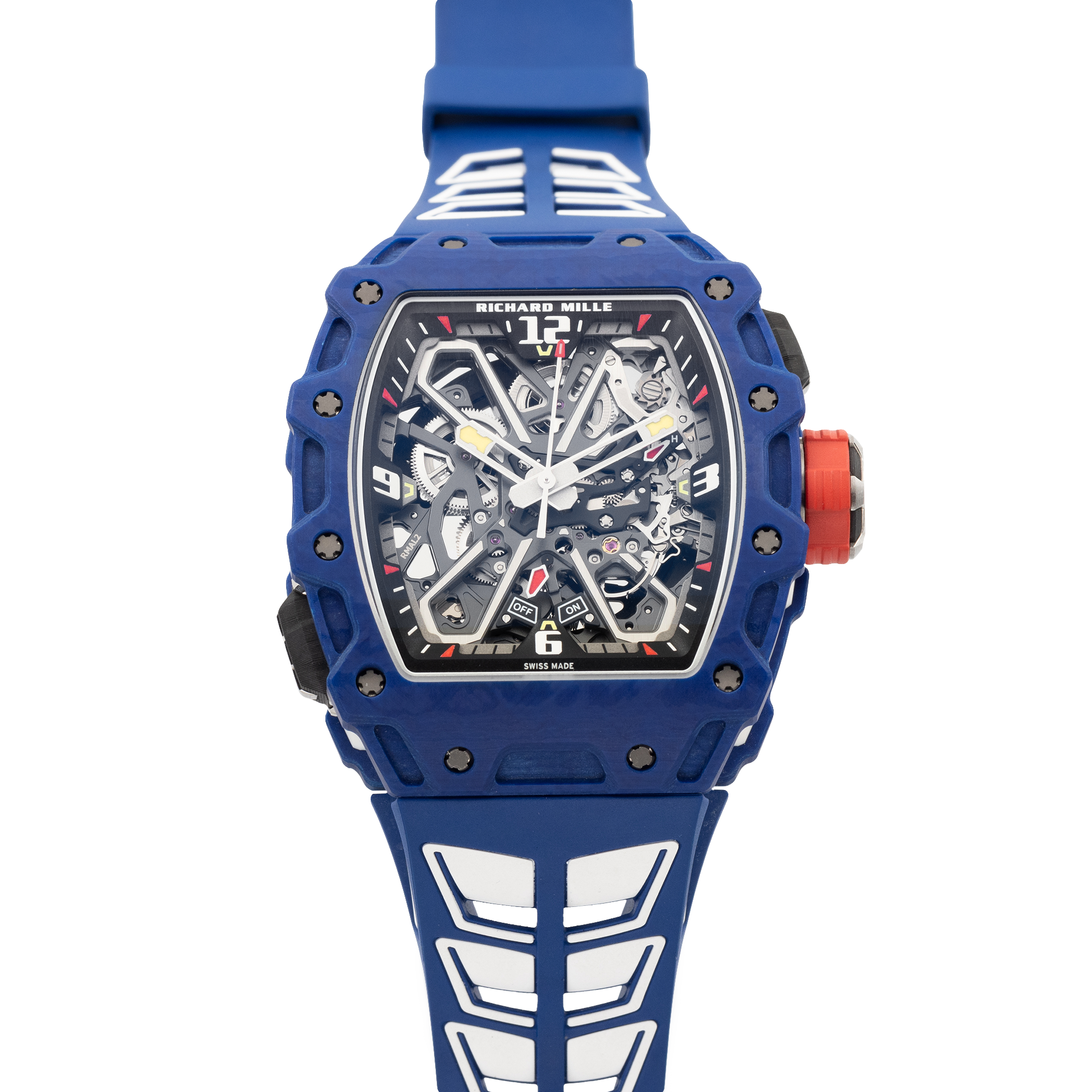 Introducing the Richard Mille RM35-03, a cutting-edge timepiece designed for performance and style. This 48 mm watch features a striking skeletonized dial that showcases its intricate movement, emphasizing both its technical prowess and aesthetic appeal. Crafted from advanced Carbon TPT and Quartz TPT, the case is not only lightweight but also water-resistant up to 50 meters, ensuring durability under various conditions. The innovative butterfly rotor allows users to adjust the winding mechanism according to their activity level, optimizing performance on demand. The self-winding movement, featuring a free-sprung balance with variable inertia, guarantees exceptional precision and shock resistance. With a power reserve of 55 hours and 38 jewels, this watch is engineered for reliability. The RM35-03 is completed with a comfortable white & Blue rubber strap and a titanium pin buckle, making it a perfect blend of luxury and functionality for those who appreciate cutting-edge horology.Read More