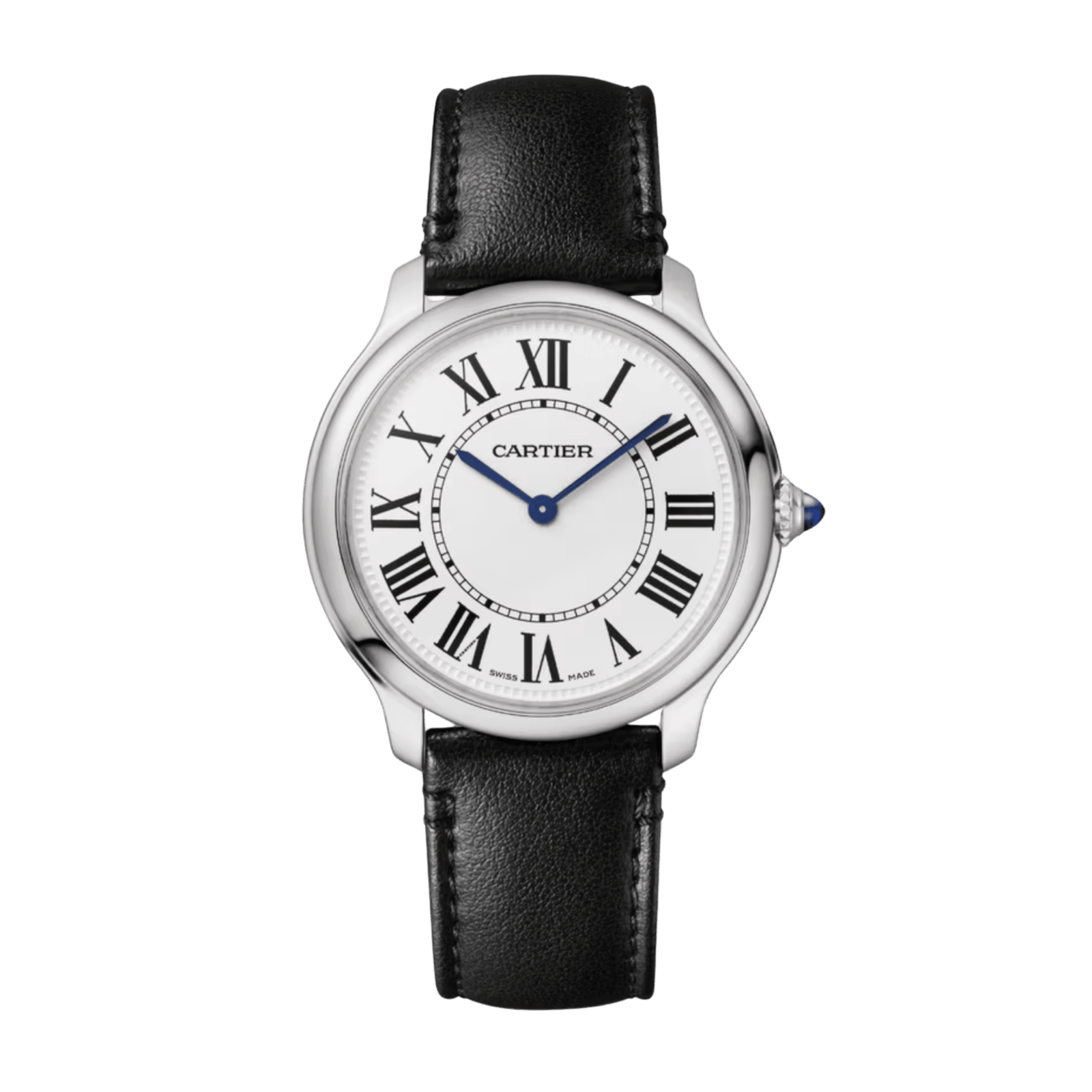 The Cartier Ronde Must de Cartier Steel Silver Dial 36mm Ref. WSRN0031 features a 36mm stainless steel case with a classic round profile and slim 7.89mm thickness, delivering understated elegance suitable for daily wear. Its sandblasted silvered dial is marked by bold Roman numerals and blue sword-shaped hands, protected by a scratch-resistant sapphire crystal. The beaded crown is set with a synthetic cabochon-shaped spinel, underscoring Cartier’s attention to signature details. This model is powered by a high-autonomy quartz movement offering an impressive battery life of approximately 8 years for reliable, low-maintenance precision. Paired with a black strap crafted without animal materials and secured by a stainless steel ardillon buckle, the watch is designed for both comfort and sustainability. With 30-meter water resistance, the Ronde Must de Cartier stands out for its blend of modern practicality, enduring Cartier design codes, and ease of use.Read More