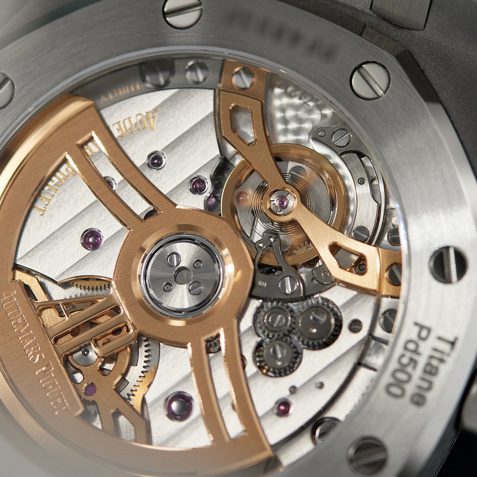 The 39mm case and bracelet combine titanium with a central case middle made of Bulk Metallic Glass, a zirconium-based alloy known for its amorphous structure and exceptional hardness. Inside, Audemars Piguet’s calibre 7121 delivers automatic precision with a 55-hour power reserve, housed in a case that stands just 8.1mm thick. Water-resistance is rated to 50m, underscoring this piece’s practical edge despite its refinement.