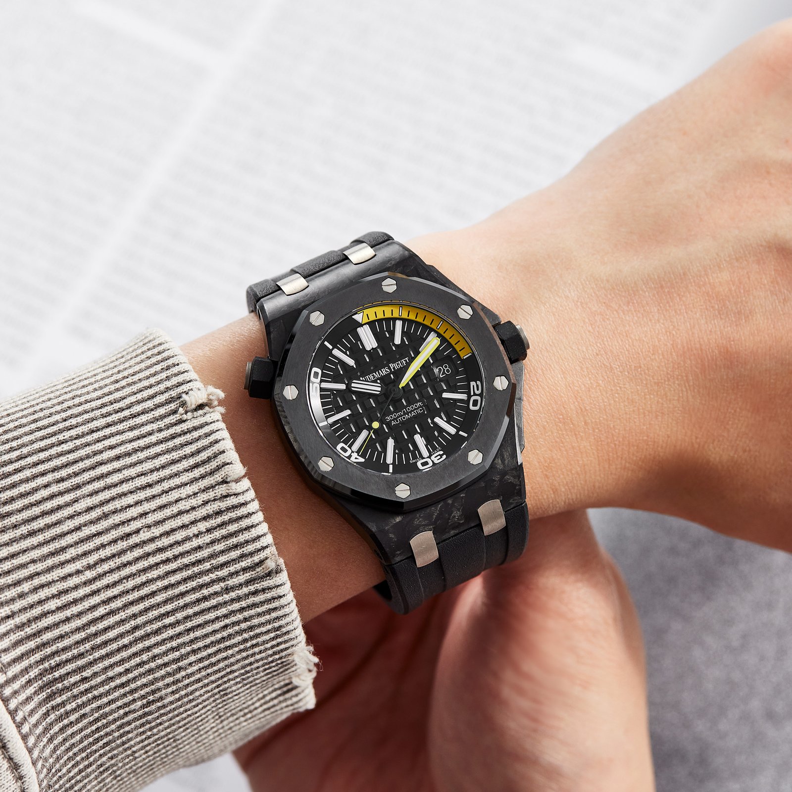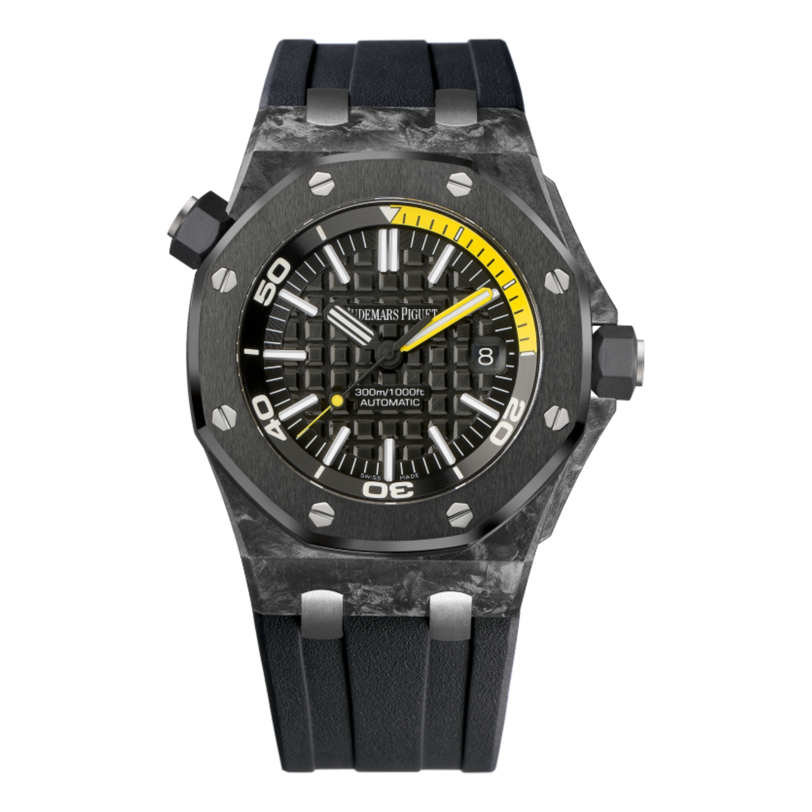 The Audemars Piguet Royal Oak Offshore Diver Carbon Black Dial 42mm Ref. 15706AU.OO.A002CA.01 combines advanced dive features with bold materials and signature Royal Oak Offshore design. This 42mm selfwinding diver features a forged carbon case, a black ceramic bezel, and a glareproofed sapphire crystal for maximum durability. The titanium caseback and screw-locked crown ensure robust water resistance up to 300 meters, making this model suitable for serious diving. The black “Grande Tapisserie” dial is equipped with luminescent indexes and hands, offering excellent legibility in low-light conditions. Powered by the calibre AP 3120 automatic movement, the watch delivers a 60-hour power reserve and includes a date function. The black rubber strap is secured by a titanium pin buckle, with titanium links providing added strength. Key highlights include the lightweight forged carbon construction, high-performance ceramic bezel, and professional-grade water resistance, making this Royal Oak Offshore Diver a standout tool watch.Read More