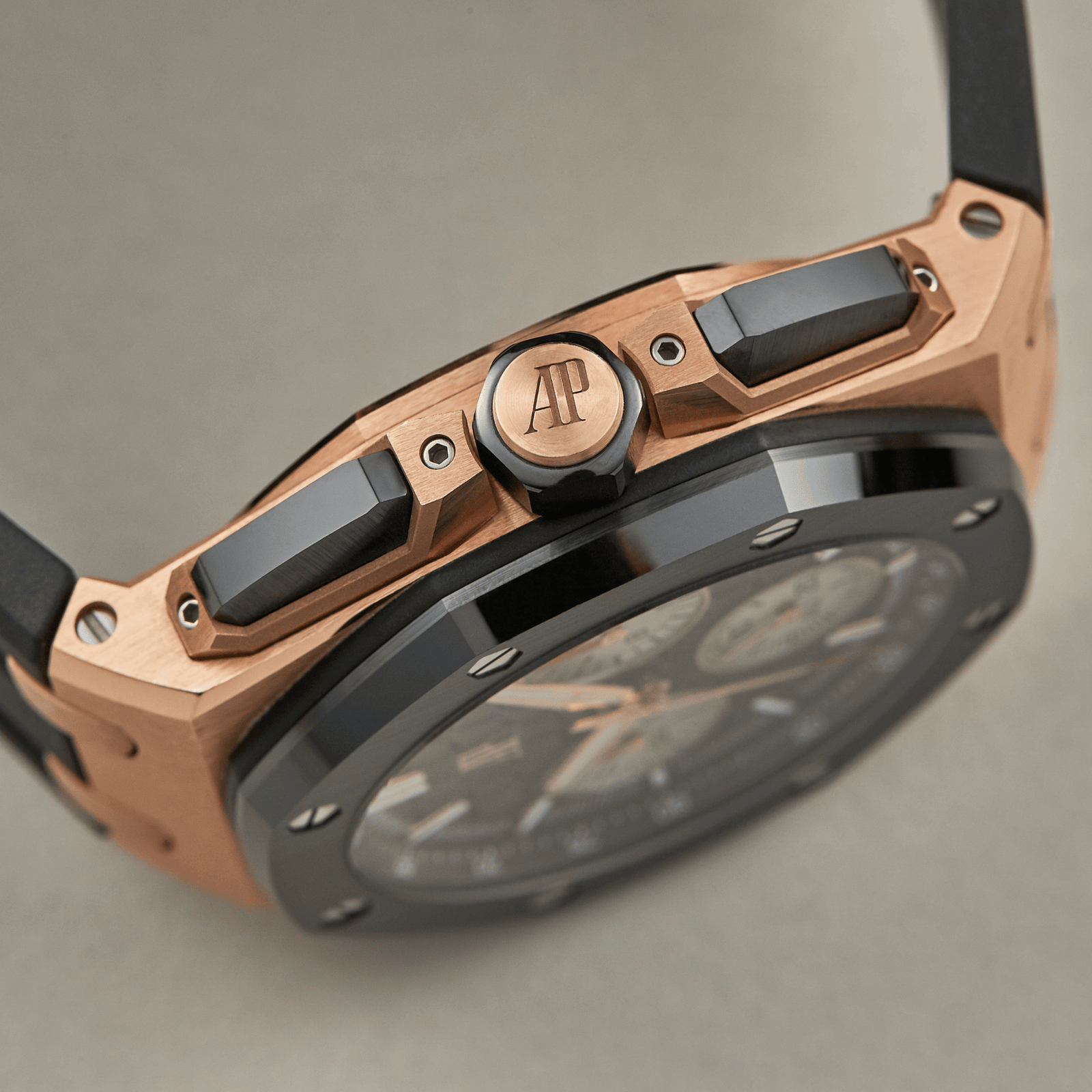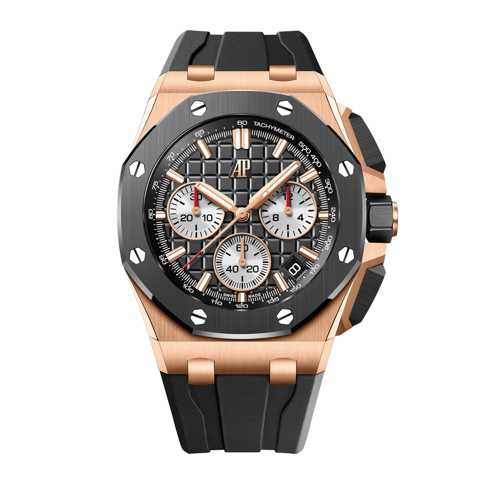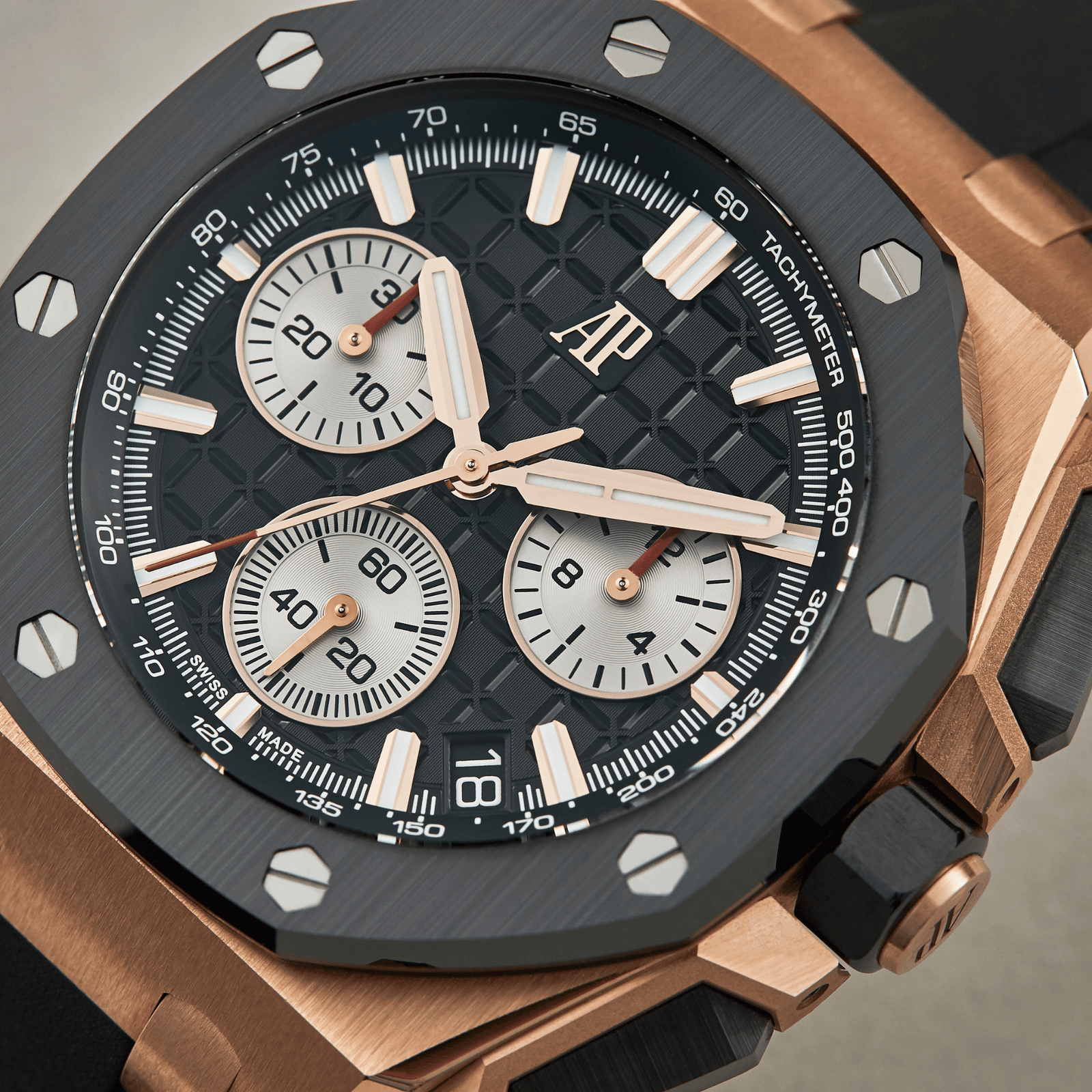 Introducing the Audemars Piguet Royal Oak Offshore, a bold fusion of sophistication and sportiness. This 43 mm timepiece features an 18-carat pink gold case paired with a striking black ceramic bezel, showcasing a refined black “Méga Tapisserie” dial. The rhodium-toned counters and pink gold applied hour markers enhance its luxurious appeal. Powered by the self-winding Caliber 4401 movement, this watch offers a robust 70-hour power reserve and essential functions including hours, minutes, date, and chronograph with flyback capabilities. Water-resistant up to 100 meters, it is designed for both active and formal occasions. The watch is completed with an interchangeable black rubber strap, secured by a rose gold pin buckle for a secure and comfortable fit. With its combination of advanced engineering and elegant design, the Audemars Piguet Royal Oak Offshore ref. 26420RO.OO.A002CA.01 is perfect for those who appreciate high-performance timepieces with a striking aesthetic.Read More