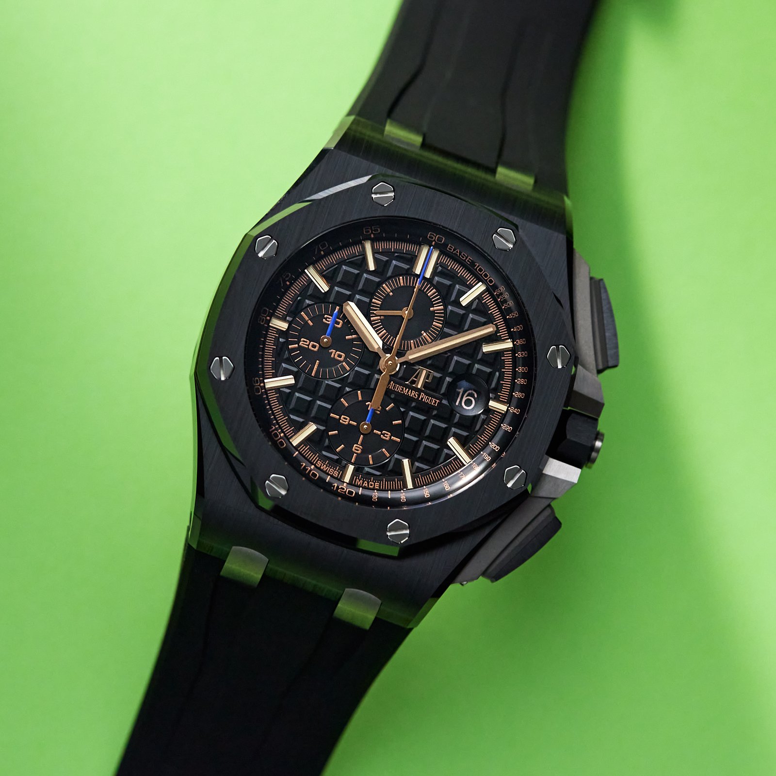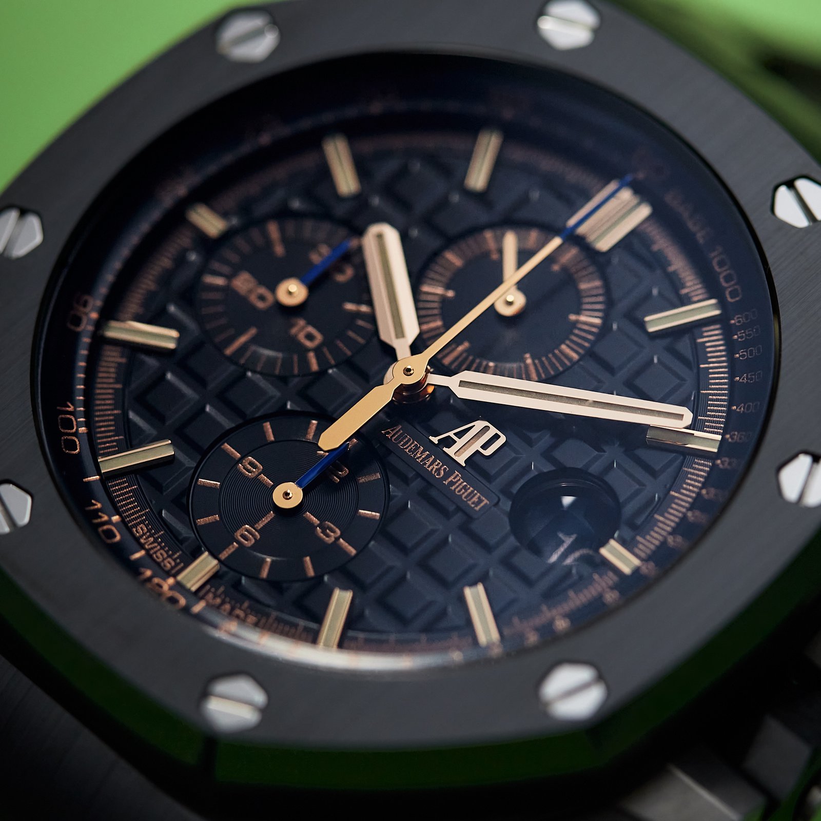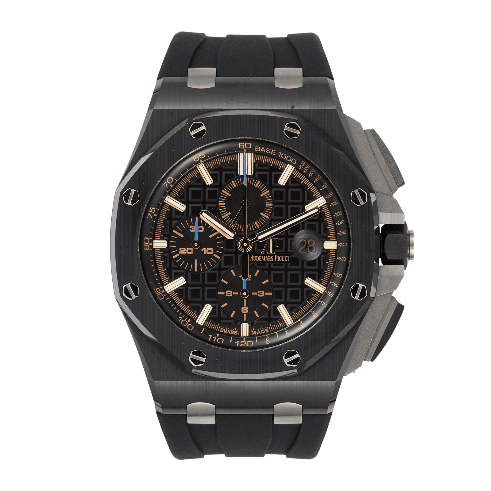 The Audemars Piguet Royal Oak Offshore Titanium Black Dial 44mm is a powerhouse of luxury and performance, embodying the spirit of the iconic Royal Oak collection. Renowned for its bold design and technical prowess, this model is perfect for those who appreciate both style and functionality. Featuring a robust black ceramic case that measures 44mm in diameter and 14.5mm in thickness, this watch is engineered for durability. The striking anthracite dial showcases the signature “Méga Tapisserie” pattern, complemented by anthracite counters at 12, 6, and 9 o’clock, and white gold applied hour markers. The luminescent Royal Oak hands ensure visibility in low light conditions. Powered by the Calibre 3126/3840, this self-winding chronograph provides essential functions, including hours, minutes, small seconds, and date display, with a 50-hour power reserve. Water-resistant up to 100 meters, it’s suitable for both everyday wear and adventurous activities. The black rubber strap with a titanium pin buckle adds to its sporty appeal. The Audemars Piguet Royal Oak Offshore is more than a watch; it’s a statement of sophistication and reliability.Read More
