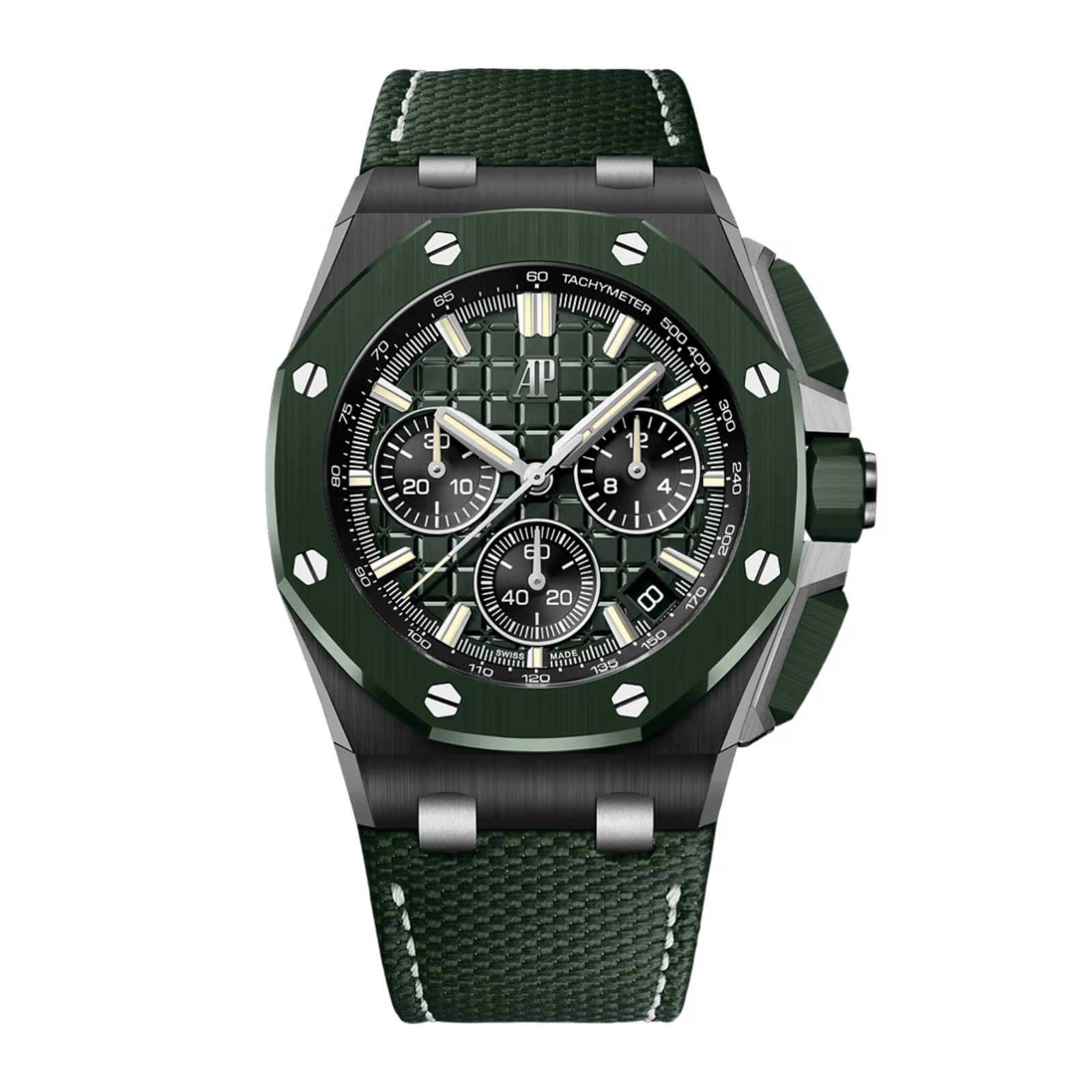 The Audemars Piguet Royal Oak Offshore Titanium & Ceramic Green Dial 43mm Ref. 26420CE.OO.A063VE.01 showcases a modern three-tone design, combining a 43mm black ceramic case middle with a green ceramic bezel, push-pieces, and crown, all reinforced by titanium elements for added durability. The dark green “Méga Tapisserie” dial features black counters, a matching green inner bezel, and 18-carat white gold hour markers and hands, each filled with luminescent material for enhanced legibility. Inside, the selfwinding Calibre AP 4401 delivers a 70-hour power reserve and features chronograph, date, hours, minutes, and seconds functions. The watch is water-resistant to 100 meters and includes an interchangeable dark green textured leather strap with a titanium pin buckle, plus an additional black rubber strap for versatility. The Royal Oak Offshore 26420CE.OO.A063VE.01 stands out for its robust construction, signature dial pattern, and practical quick-change strap system.Read More