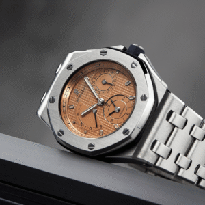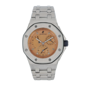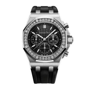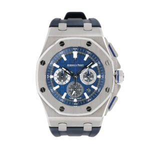 The Audemars Piguet Royal Oak Offshore Tourbillon Chronograph Titanium Silver Dial 44mm Ref. 26387IO.OO.D002CA.01 merges advanced horology with distinctive Royal Oak Offshore design. Released in 2014, this 44mm chronograph features a lightweight titanium case and a black ceramic bezel, offering a strong balance of durability and comfort. The silver dial is equipped with Arabic numerals and highlights the tourbillon escapement, a technical focal point for precision timekeeping. Powered by the manual winding Calibre AP 2933, this model delivers an impressive 237-hour power reserve. The chronograph function integrates seamlessly, while a sapphire crystal ensures optimal scratch resistance. Water resistance is rated at 100 meters. The black rubber strap, secured with a titanium pin buckle, provides a secure fit and a modern edge. This Audemars Piguet reference stands out for its technical complexity and use of advanced materials, appealing to collectors and enthusiasts seeking a high-performance tourbillon chronograph.Read More