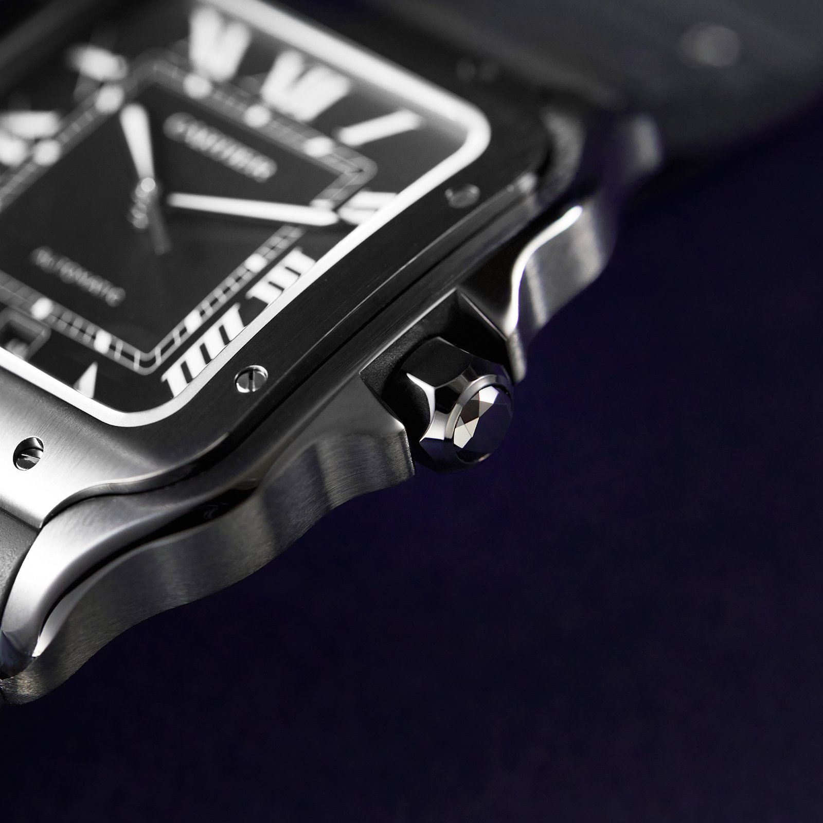The Santos de Cartier Stainless Steel PVD Black Dial ref. WSSA0039 is a sleek and contemporary timepiece that showcases the iconic Santos de Cartier design. The 39mm stainless steel case features a black PVD coating, adding a bold and modern touch. The black dial is adorned with luminous white Roman numerals and sword-shaped hands, ensuring excellent legibility. Powered by a precise selfwinding Calibre 1847 MC movement, this watch offers accurate timekeeping. The black alligator leather alongside an additional rubber strap with a stainless steel PVD folding clasp enhances its sophisticated appeal. With a water resistance of 100 meters, it is suitable for various activities. The Santos de Cartier Stainless Steel PVD Black Dial ref. WSSA0039 is a statement piece that combines style, functionality, and the heritage of Cartier.