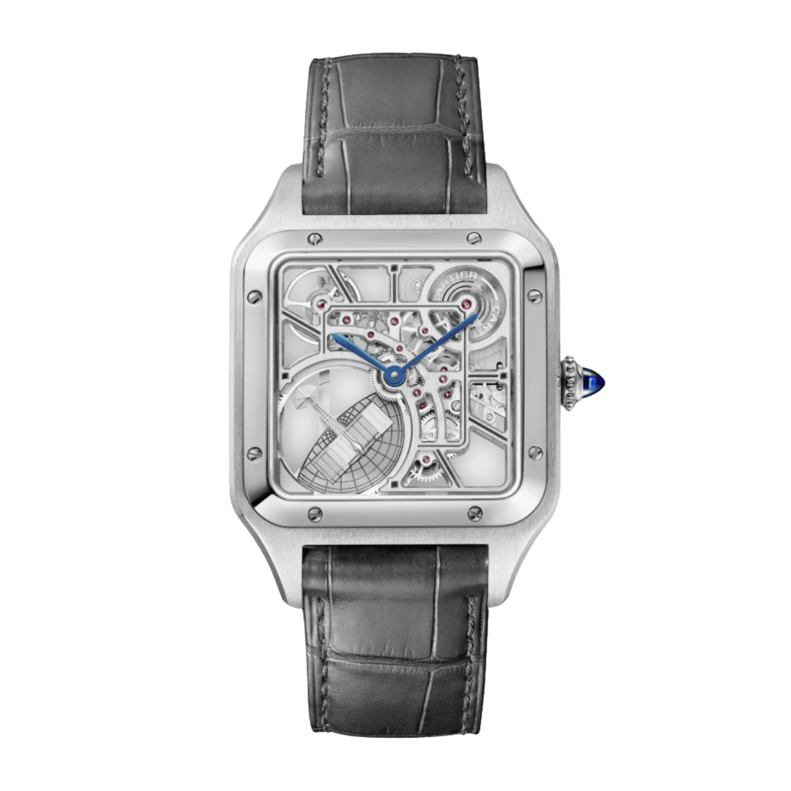 Housed in a 43mm stainless steel case, the watch is defined by its openworked dial, which doubles as the movement bridge and forms the shape of a stylised Roman numeral “VIII”. Powered by the ultra-thin calibre 9629 MC, developed specifically for this model, it features a platinum micro-rotor decorated with Alberto Santos-Dumont’s initials. The manual construction offers a 44-hour power reserve. Water-resistant to 30m, the case is topped with a beaded crown set with a blue cabochon – a Cartier signature – while the crisp geometry of the case remains true to the lineage first introduced in 1904.