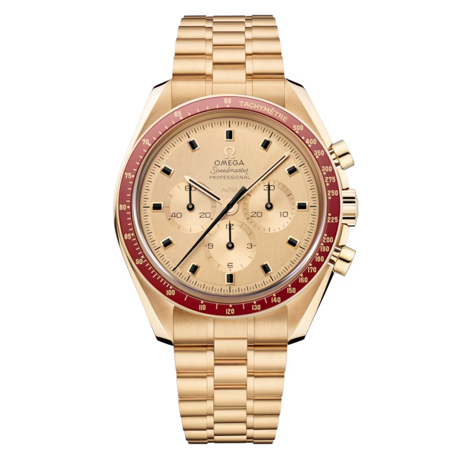 The Omega Speedmaster Professional Moonwatch “Apollo 11” 50th Anniversary Yellow Gold 42mm Ref. 310.60.42.50.99.001 commemorates the first moon landing with a design rooted in history and craftsmanship. Crafted from 18K Moonshine gold, this limited edition of 1,014 pieces features a 42mm case paired with a burgundy ceramic bezel ring, echoing the 1969 original. The vertically brushed step dial, also in 18K Moonshine gold, is accented by faceted onyx hour markers and burgundy detailing for a striking contrast. Powered by the manually wound OMEGA Master Chronometer Calibre 3861, the watch offers precision, a 50-hour power reserve, and chronograph functionality. Its sapphire crystal case back reveals a blackened decorative ring with a partial world map and lunar meteorite inlay, symbolizing the Earth and Moon in their true proportions. Finished with a matching 18K Moonshine gold bracelet and deployment clasp, this commemorative timepiece is water-resistant to 50 meters and celebrates a milestone in space exploration.Read More