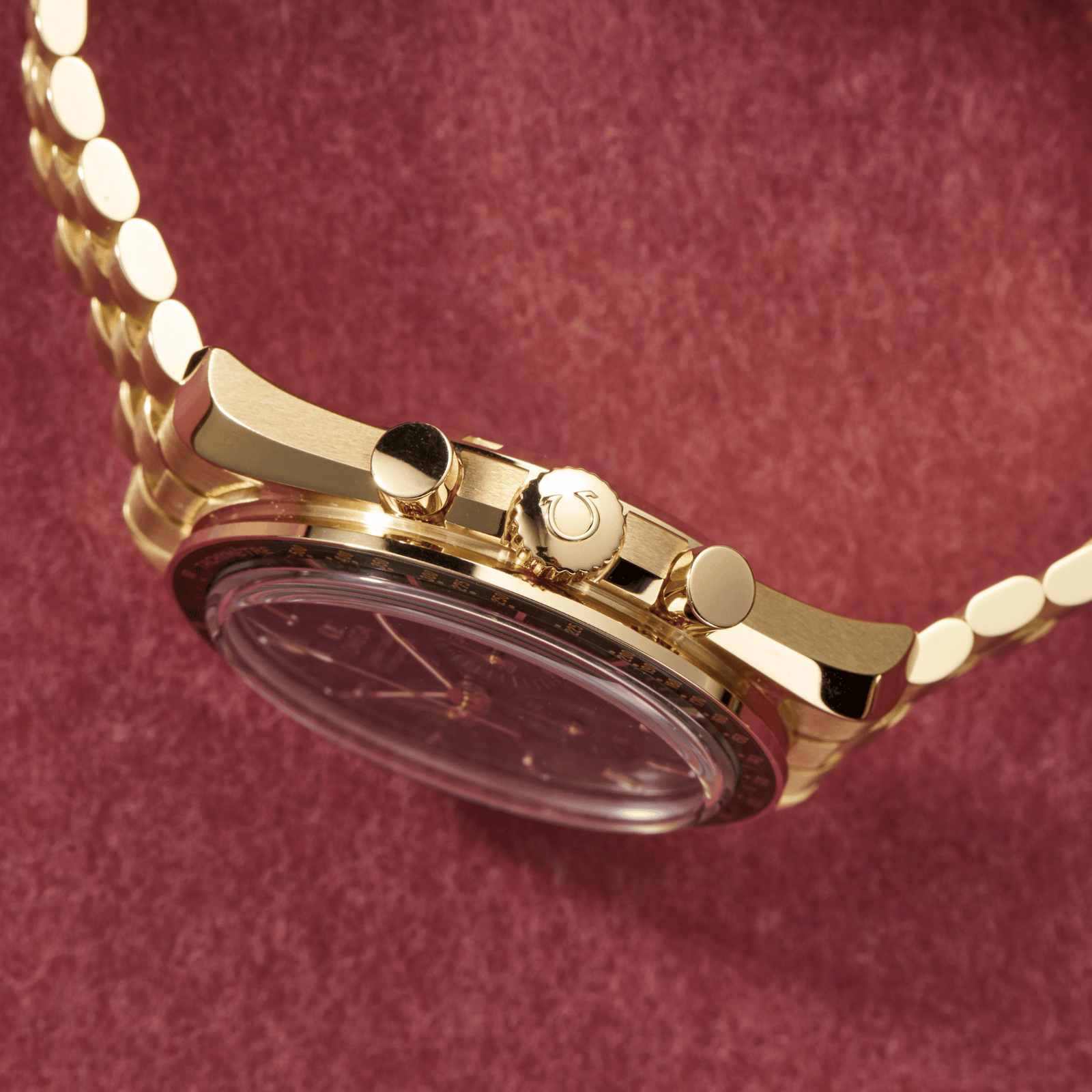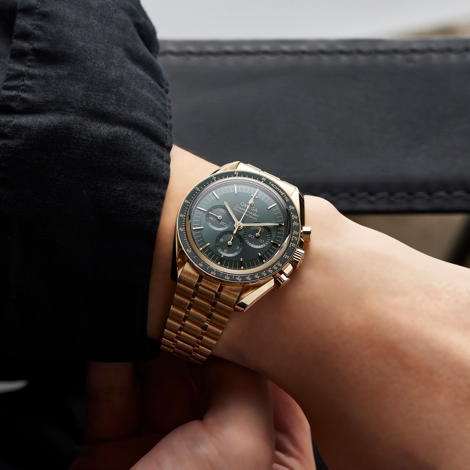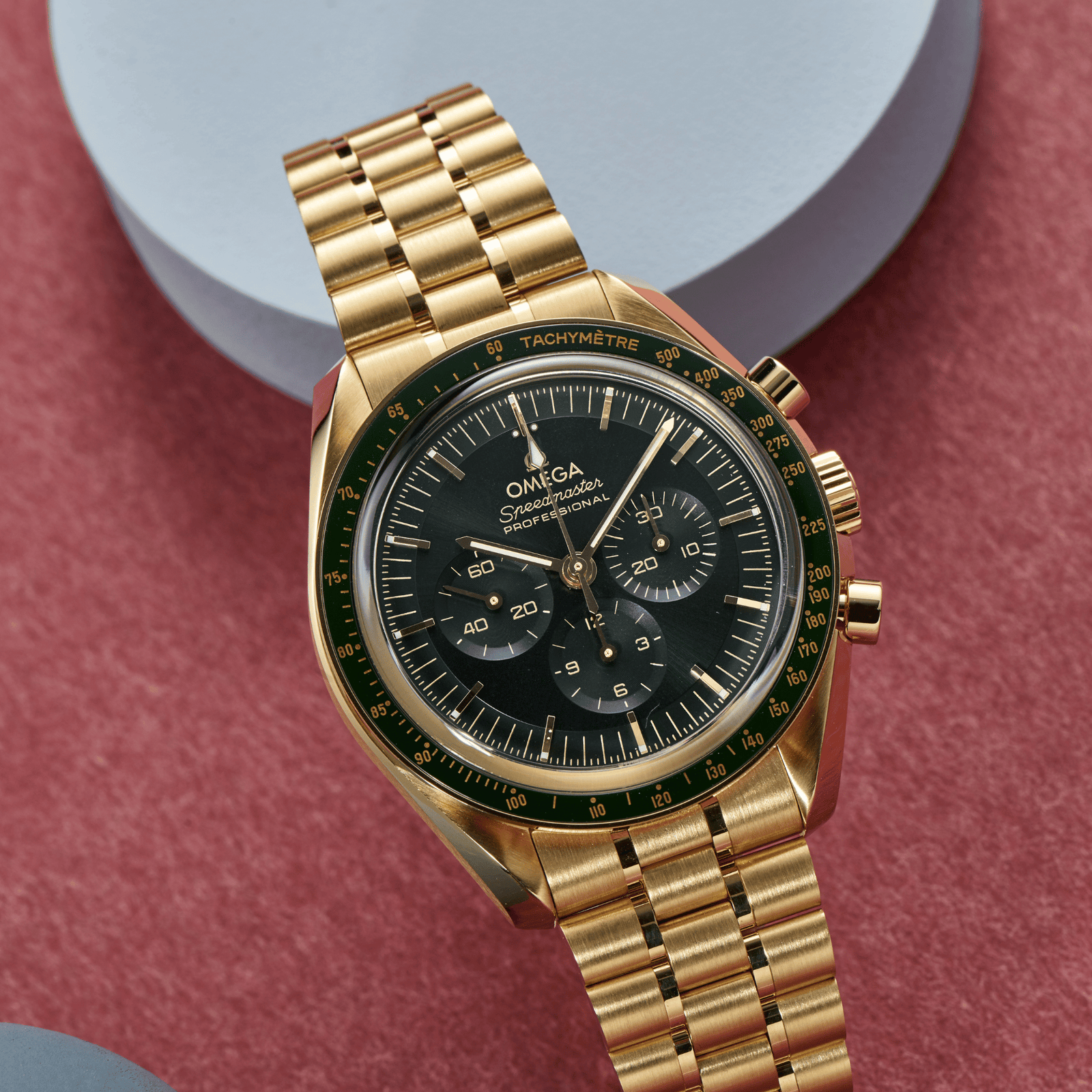 For over six decades, the Omega Speedmaster Moonwatch has established its iconic status as the official watch worn by NASA astronauts during their historic moon missions. From the Apollo 11 mission in 1969 to subsequent lunar explorations, this legendary timepiece has stood the test of time, proving its reliability, precision, and enduring style. Released in 2022, the Speedmaster Moonwatch Chronograph Moonshine Gold Green Dial ref. 310.60.42.50.10.001 is a fine addition to the already renowned collection. The case of the timepiece is meticulously fashioned from Omega’s patented Moonshine gold, an exclusive alloy that radiates a distinctive pale yellow hue. Complementing the Moonshine gold case is a captivating green dial that pays homage to the celestial allure of the moon, helping add depth and dimension to its charm. As expected from Omega’s Speedmasters, it is powered by an exceptionally crafted movement, in this case, a Co-Axial Master Chronometer Calibre 3861, a state-of-the-art movement renowned for its precision, reliability, and anti-magnetic properties. This mechanical masterpiece not only ensures accurate timekeeping but also upholds the Moonwatch’s legacy of brilliant performance. The watch comes adorned with a matching Moonshine gold bracelet, featuring a comfortable and secure folding clasp. Its elegant design seamlessly merges form and function, allowing for a seamless fit on the wrist. Whether an avid watch collector, an admirer of horological craftsmanship, or a connoisseur of timeless elegance, the Omega Speedmaster Moonwatch Moonshine Gold Green Dial ref. 310.60.42.50.10.001 is a compelling choice that transcends boundaries and captures the essence of extraordinary timekeeping. With its rich heritage, impeccable design, and remarkable features, this watch is destined to become a cherished heirloom, embodying the spirit of exploration and a timeless legacy.